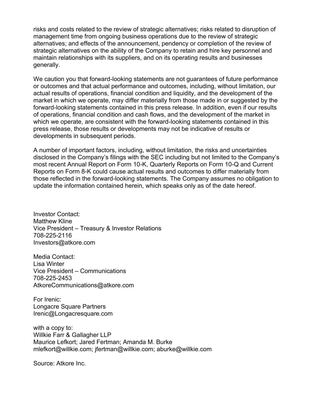 risks and costs related to the review of strategic alternatives; risks related to disruption of management time from ongoing business operations due to the review of strategic alternatives; and effects of the announcement, pendency or completion of the review of strategic alternatives on the ability of the Company to retain and hire key personnel and maintain relationships with its suppliers, and on its operating results and businesses generally. We caution you that forward-looking statements are not guarantees of future performance or outcomes and that actual performance and outcomes, including, without limitation, our actual results of operations, financial condition and liquidity, and the development of the market in which we operate, may differ materially from those made in or suggested by the forward-looking statements contained in this press release. In addition, even if our results of operations, financial condition and cash flows, and the development of the market in which we operate, are consistent with the forward-looking statements contained in this press release, those results or developments may not be indicative of results or developments in subsequent periods. A number of important factors, including, without limitation, the risks and uncertainties disclosed in the Company’s filings with the SEC including but not limited to the Company’s most recent Annual Report on Form 10-K, Quarterly Reports on Form 10-Q and Current Reports on Form 8-K could cause actual results and outcomes to differ materially from those reflected in the forward-looking statements. The Company assumes no obligation to update the information contained herein, which speaks only as of the date hereof. Investor Contact: Matthew Kline Vice President – Treasury & Investor Relations 708-225-2116 Investors@atkore.com Media Contact: Lisa Winter Vice President – Communications 708-225-2453 AtkoreCommunications@atkore.com For Irenic: Longacre Square Partners Irenic@Longacresquare.com with a copy to: Willkie Farr & Gallagher LLP Maurice Lefkort; Jared Fertman; Amanda M. Burke mlefkort@willkie.com; jfertman@willkie.com; aburke@willkie.com Source: Atkore Inc.