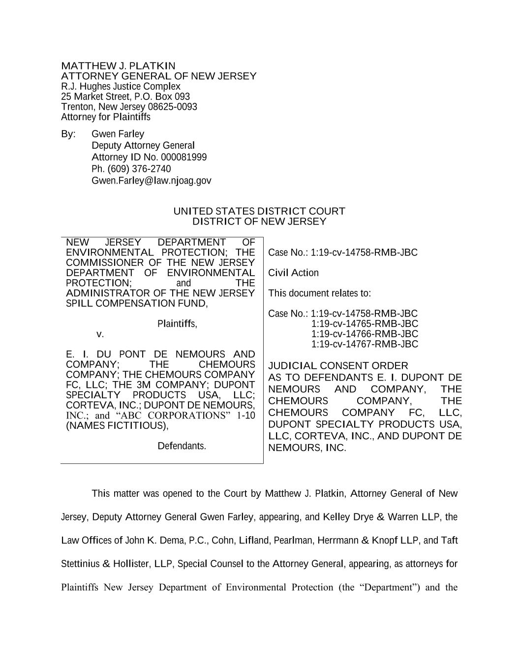 MATTHEW J. PLATKIN ATTORNEY GENERAL OF NEW JERSEY R.J. Hughes Justice Complex 25 Market Street, P.O. Box 093 Trenton, New Jersey 08625-0093 Attorney for Plaintiffs By: Gwen Farley Deputy Attorney General Attorney ID No. 000081999 Ph. (609) 376-2740 Gwen.Farley@law.njoag.gov UNITED STATES DISTRICT COURT DISTRICT OF NEW JERSEY NEW JERSEY DEPARTMENT OF ENVIRONMENTAL PROTECTION; THE COMMISSIONER OF THE NEW JERSEY DEPARTMENT OF ENVIRONMENTAL PROTECTION; and THE ADMINISTRATOR OF THE NEW JERSEY SPILL COMPENSATION FUND, Plaintiffs, v. E. I. DU PONT DE NEMOURS AND COMPANY; THE CHEMOURS COMPANY; THE CHEMOURS COMPANY FC, LLC; THE 3M COMPANY; DUPONT SPECIALTY PRODUCTS USA, LLC; CORTEVA, INC.; DUPONT DE NEMOURS, INC.; and “ABC CORPORATIONS” 1-10 (NAMES FICTITIOUS), Defendants. Case No.: 1:19-cv-14758-RMB-JBC Civil Action This document relates to: Case No.: 1:19-cv-14758-RMB-JBC 1:19-cv-14765-RMB-JBC 1:19-cv-14766-RMB-JBC 1:19-cv-14767-RMB-JBC JUDICIAL CONSENT ORDER AS TO DEFENDANTS E. I. DUPONT DE NEMOURS AND COMPANY, THE CHEMOURS COMPANY, THE CHEMOURS COMPANY FC, LLC, DUPONT SPECIALTY PRODUCTS USA, LLC, CORTEVA, INC., AND DUPONT DE NEMOURS, INC. This matter was opened to the Court by Matthew J. Platkin, Attorney General of New Jersey, Deputy Attorney General Gwen Farley, appearing, and Kelley Drye & Warren LLP, the Law Offices of John K. Dema, P.C., Cohn, Lifland, Pearlman, Herrmann & Knopf LLP, and Taft Stettinius & Hollister, LLP, Special Counsel to the Attorney General, appearing, as attorneys for Plaintiffs New Jersey Department of Environmental Protection (the “Department”) and the