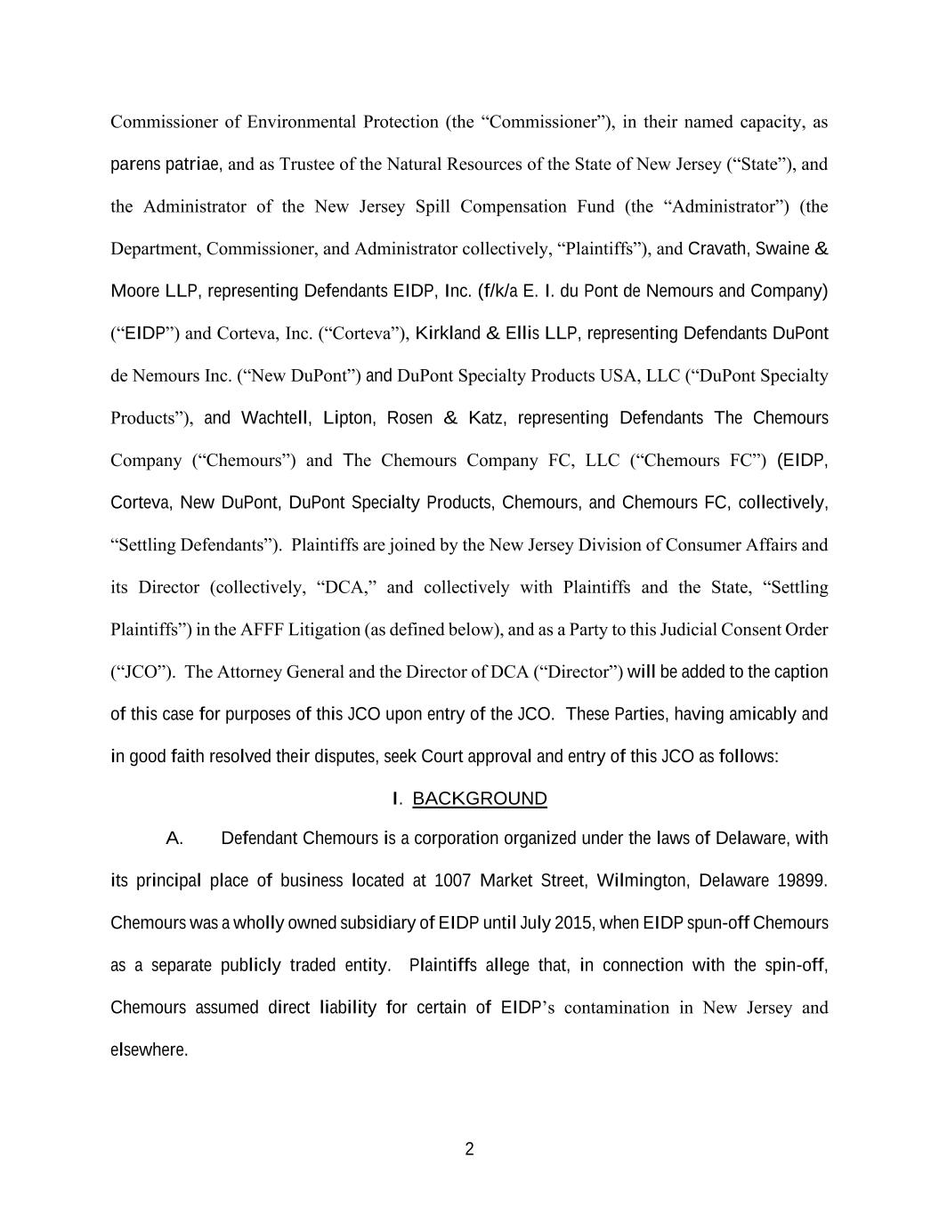 2 Commissioner of Environmental Protection (the “Commissioner”), in their named capacity, as parens patriae, and as Trustee of the Natural Resources of the State of New Jersey (“State”), and the Administrator of the New Jersey Spill Compensation Fund (the “Administrator”) (the Department, Commissioner, and Administrator collectively, “Plaintiffs”), and Cravath, Swaine & Moore LLP, representing Defendants EIDP, Inc. (f/k/a E. I. du Pont de Nemours and Company) (“EIDP”) and Corteva, Inc. (“Corteva”), Kirkland & Ellis LLP, representing Defendants DuPont de Nemours Inc. (“New DuPont”) and DuPont Specialty Products USA, LLC (“DuPont Specialty Products”), and Wachtell, Lipton, Rosen & Katz, representing Defendants The Chemours Company (“Chemours”) and The Chemours Company FC, LLC (“Chemours FC”) (EIDP, Corteva, New DuPont, DuPont Specialty Products, Chemours, and Chemours FC, collectively, “Settling Defendants”). Plaintiffs are joined by the New Jersey Division of Consumer Affairs and its Director (collectively, “DCA,” and collectively with Plaintiffs and the State, “Settling Plaintiffs”) in the AFFF Litigation (as defined below), and as a Party to this Judicial Consent Order (“JCO”). The Attorney General and the Director of DCA (“Director”) will be added to the caption of this case for purposes of this JCO upon entry of the JCO. These Parties, having amicably and in good faith resolved their disputes, seek Court approval and entry of this JCO as follows: I. BACKGROUND A. Defendant Chemours is a corporation organized under the laws of Delaware, with its principal place of business located at 1007 Market Street, Wilmington, Delaware 19899. Chemours was a wholly owned subsidiary of EIDP until July 2015, when EIDP spun-off Chemours as a separate publicly traded entity. Plaintiffs allege that, in connection with the spin-off, Chemours assumed direct liability for certain of EIDP’s contamination in New Jersey and elsewhere.