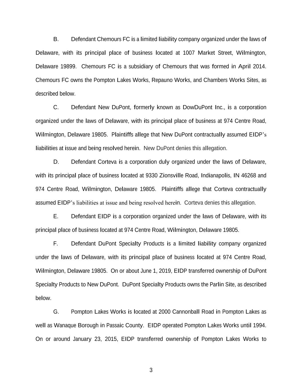 3 B. Defendant Chemours FC is a limited liability company organized under the laws of Delaware, with its principal place of business located at 1007 Market Street, Wilmington, Delaware 19899. Chemours FC is a subsidiary of Chemours that was formed in April 2014. Chemours FC owns the Pompton Lakes Works, Repauno Works, and Chambers Works Sites, as described below. C. Defendant New DuPont, formerly known as DowDuPont Inc., is a corporation organized under the laws of Delaware, with its principal place of business at 974 Centre Road, Wilmington, Delaware 19805. Plaintiffs allege that New DuPont contractually assumed EIDP’s liabilities at issue and being resolved herein. New DuPont denies this allegation. D. Defendant Corteva is a corporation duly organized under the laws of Delaware, with its principal place of business located at 9330 Zionsville Road, Indianapolis, IN 46268 and 974 Centre Road, Wilmington, Delaware 19805. Plaintiffs allege that Corteva contractually assumed EIDP’s liabilities at issue and being resolved herein. Corteva denies this allegation. E. Defendant EIDP is a corporation organized under the laws of Delaware, with its principal place of business located at 974 Centre Road, Wilmington, Delaware 19805. F. Defendant DuPont Specialty Products is a limited liability company organized under the laws of Delaware, with its principal place of business located at 974 Centre Road, Wilmington, Delaware 19805. On or about June 1, 2019, EIDP transferred ownership of DuPont Specialty Products to New DuPont. DuPont Specialty Products owns the Parlin Site, as described below. G. Pompton Lakes Works is located at 2000 Cannonball Road in Pompton Lakes as well as Wanaque Borough in Passaic County. EIDP operated Pompton Lakes Works until 1994. On or around January 23, 2015, EIDP transferred ownership of Pompton Lakes Works to