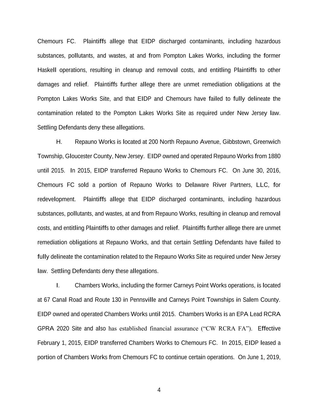 4 Chemours FC. Plaintiffs allege that EIDP discharged contaminants, including hazardous substances, pollutants, and wastes, at and from Pompton Lakes Works, including the former Haskell operations, resulting in cleanup and removal costs, and entitling Plaintiffs to other damages and relief. Plaintiffs further allege there are unmet remediation obligations at the Pompton Lakes Works Site, and that EIDP and Chemours have failed to fully delineate the contamination related to the Pompton Lakes Works Site as required under New Jersey law. Settling Defendants deny these allegations. H. Repauno Works is located at 200 North Repauno Avenue, Gibbstown, Greenwich Township, Gloucester County, New Jersey. EIDP owned and operated Repauno Works from 1880 until 2015. In 2015, EIDP transferred Repauno Works to Chemours FC. On June 30, 2016, Chemours FC sold a portion of Repauno Works to Delaware River Partners, LLC, for redevelopment. Plaintiffs allege that EIDP discharged contaminants, including hazardous substances, pollutants, and wastes, at and from Repauno Works, resulting in cleanup and removal costs, and entitling Plaintiffs to other damages and relief. Plaintiffs further allege there are unmet remediation obligations at Repauno Works, and that certain Settling Defendants have failed to fully delineate the contamination related to the Repauno Works Site as required under New Jersey law. Settling Defendants deny these allegations. I. Chambers Works, including the former Carneys Point Works operations, is located at 67 Canal Road and Route 130 in Pennsville and Carneys Point Townships in Salem County. EIDP owned and operated Chambers Works until 2015. Chambers Works is an EPA Lead RCRA GPRA 2020 Site and also has established financial assurance (“CW RCRA FA”). Effective February 1, 2015, EIDP transferred Chambers Works to Chemours FC. In 2015, EIDP leased a portion of Chambers Works from Chemours FC to continue certain operations. On June 1, 2019,