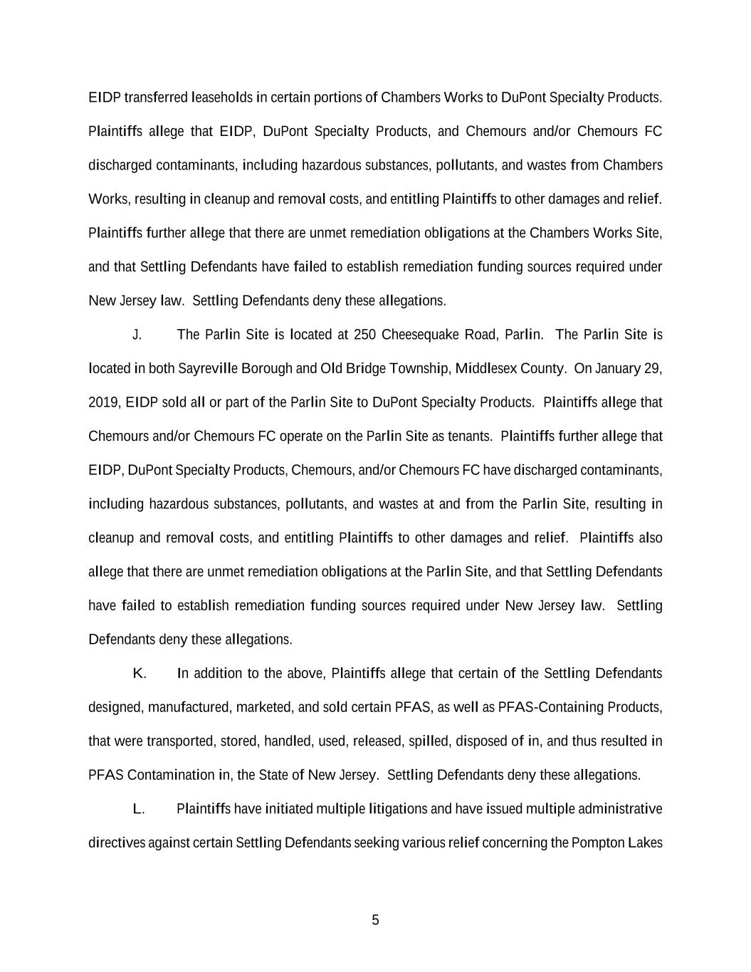 5 EIDP transferred leaseholds in certain portions of Chambers Works to DuPont Specialty Products. Plaintiffs allege that EIDP, DuPont Specialty Products, and Chemours and/or Chemours FC discharged contaminants, including hazardous substances, pollutants, and wastes from Chambers Works, resulting in cleanup and removal costs, and entitling Plaintiffs to other damages and relief. Plaintiffs further allege that there are unmet remediation obligations at the Chambers Works Site, and that Settling Defendants have failed to establish remediation funding sources required under New Jersey law. Settling Defendants deny these allegations. J. The Parlin Site is located at 250 Cheesequake Road, Parlin. The Parlin Site is located in both Sayreville Borough and Old Bridge Township, Middlesex County. On January 29, 2019, EIDP sold all or part of the Parlin Site to DuPont Specialty Products. Plaintiffs allege that Chemours and/or Chemours FC operate on the Parlin Site as tenants. Plaintiffs further allege that EIDP, DuPont Specialty Products, Chemours, and/or Chemours FC have discharged contaminants, including hazardous substances, pollutants, and wastes at and from the Parlin Site, resulting in cleanup and removal costs, and entitling Plaintiffs to other damages and relief. Plaintiffs also allege that there are unmet remediation obligations at the Parlin Site, and that Settling Defendants have failed to establish remediation funding sources required under New Jersey law. Settling Defendants deny these allegations. K. In addition to the above, Plaintiffs allege that certain of the Settling Defendants designed, manufactured, marketed, and sold certain PFAS, as well as PFAS-Containing Products, that were transported, stored, handled, used, released, spilled, disposed of in, and thus resulted in PFAS Contamination in, the State of New Jersey. Settling Defendants deny these allegations. L. Plaintiffs have initiated multiple litigations and have issued multiple administrative directives against certain Settling Defendants seeking various relief concerning the Pompton Lakes