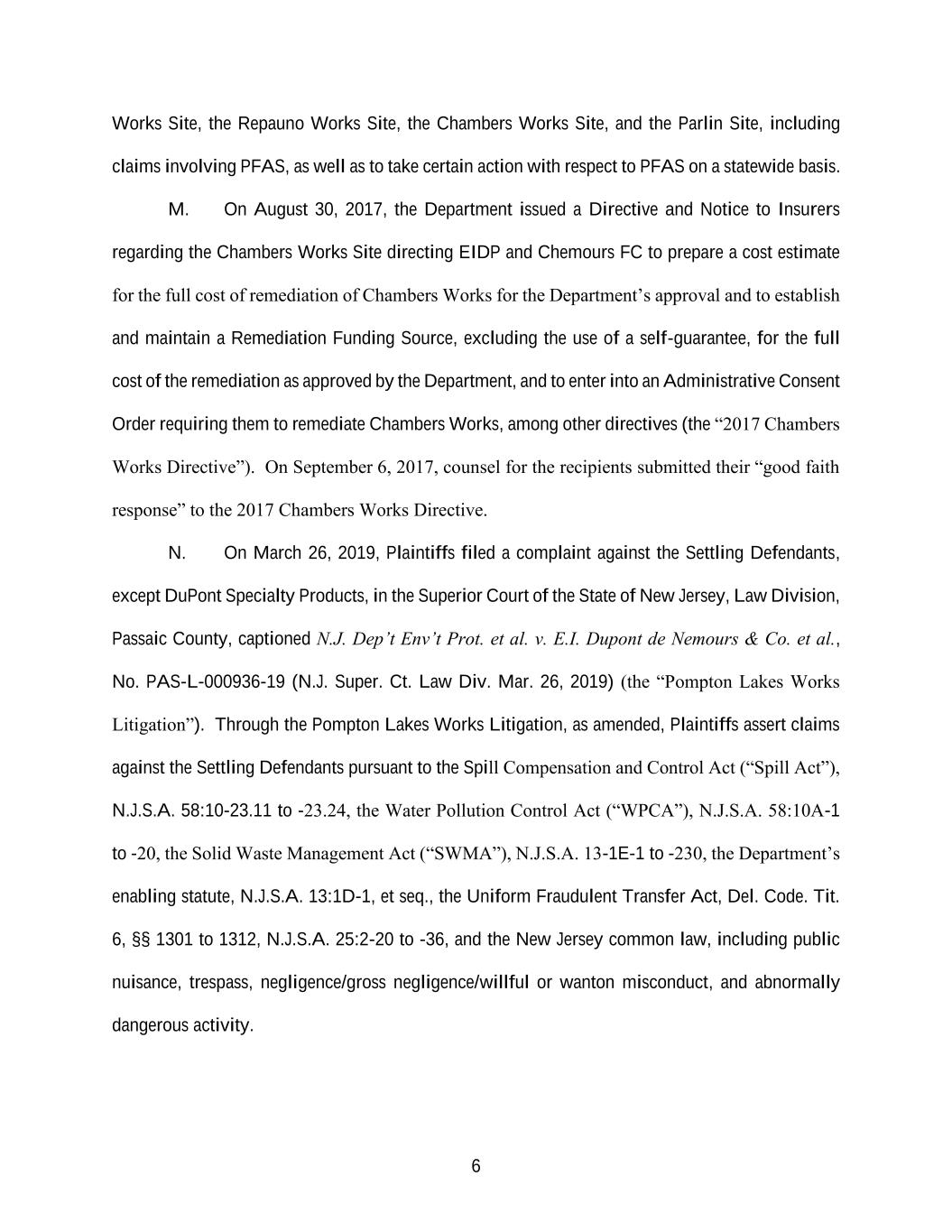 6 Works Site, the Repauno Works Site, the Chambers Works Site, and the Parlin Site, including claims involving PFAS, as well as to take certain action with respect to PFAS on a statewide basis. M. On August 30, 2017, the Department issued a Directive and Notice to Insurers regarding the Chambers Works Site directing EIDP and Chemours FC to prepare a cost estimate for the full cost of remediation of Chambers Works for the Department’s approval and to establish and maintain a Remediation Funding Source, excluding the use of a self-guarantee, for the full cost of the remediation as approved by the Department, and to enter into an Administrative Consent Order requiring them to remediate Chambers Works, among other directives (the “2017 Chambers Works Directive”). On September 6, 2017, counsel for the recipients submitted their “good faith response” to the 2017 Chambers Works Directive. N. On March 26, 2019, Plaintiffs filed a complaint against the Settling Defendants, except DuPont Specialty Products, in the Superior Court of the State of New Jersey, Law Division, Passaic County, captioned N.J. Dep’t Env’t Prot. et al. v. E.I. Dupont de Nemours & Co. et al., No. PAS-L-000936-19 (N.J. Super. Ct. Law Div. Mar. 26, 2019) (the “Pompton Lakes Works Litigation”). Through the Pompton Lakes Works Litigation, as amended, Plaintiffs assert claims against the Settling Defendants pursuant to the Spill Compensation and Control Act (“Spill Act”), N.J.S.A. 58:10-23.11 to -23.24, the Water Pollution Control Act (“WPCA”), N.J.S.A. 58:10A-1 to -20, the Solid Waste Management Act (“SWMA”), N.J.S.A. 13-1E-1 to -230, the Department’s enabling statute, N.J.S.A. 13:1D-1, et seq., the Uniform Fraudulent Transfer Act, Del. Code. Tit. 6, §§ 1301 to 1312, N.J.S.A. 25:2-20 to -36, and the New Jersey common law, including public nuisance, trespass, negligence/gross negligence/willful or wanton misconduct, and abnormally dangerous activity.