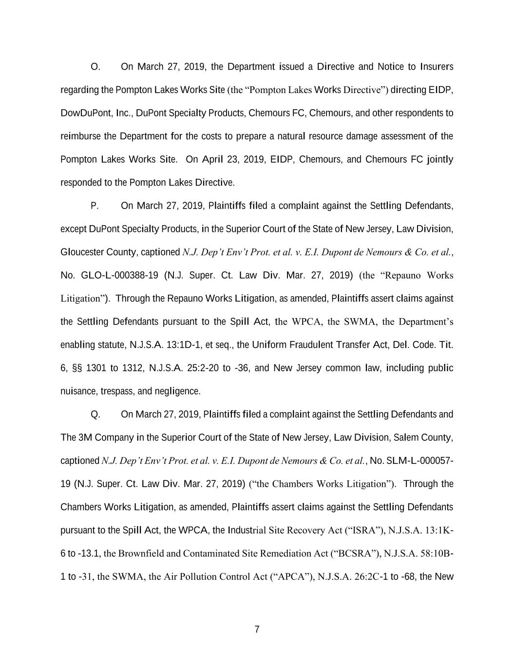 7 O. On March 27, 2019, the Department issued a Directive and Notice to Insurers regarding the Pompton Lakes Works Site (the “Pompton Lakes Works Directive”) directing EIDP, DowDuPont, Inc., DuPont Specialty Products, Chemours FC, Chemours, and other respondents to reimburse the Department for the costs to prepare a natural resource damage assessment of the Pompton Lakes Works Site. On April 23, 2019, EIDP, Chemours, and Chemours FC jointly responded to the Pompton Lakes Directive. P. On March 27, 2019, Plaintiffs filed a complaint against the Settling Defendants, except DuPont Specialty Products, in the Superior Court of the State of New Jersey, Law Division, Gloucester County, captioned N.J. Dep’t Env’t Prot. et al. v. E.I. Dupont de Nemours & Co. et al., No. GLO-L-000388-19 (N.J. Super. Ct. Law Div. Mar. 27, 2019) (the “Repauno Works Litigation”). Through the Repauno Works Litigation, as amended, Plaintiffs assert claims against the Settling Defendants pursuant to the Spill Act, the WPCA, the SWMA, the Department’s enabling statute, N.J.S.A. 13:1D-1, et seq., the Uniform Fraudulent Transfer Act, Del. Code. Tit. 6, §§ 1301 to 1312, N.J.S.A. 25:2-20 to -36, and New Jersey common law, including public nuisance, trespass, and negligence. Q. On March 27, 2019, Plaintiffs filed a complaint against the Settling Defendants and The 3M Company in the Superior Court of the State of New Jersey, Law Division, Salem County, captioned N.J. Dep’t Env’t Prot. et al. v. E.I. Dupont de Nemours & Co. et al., No. SLM-L-000057- 19 (N.J. Super. Ct. Law Div. Mar. 27, 2019) (“the Chambers Works Litigation”). Through the Chambers Works Litigation, as amended, Plaintiffs assert claims against the Settling Defendants pursuant to the Spill Act, the WPCA, the Industrial Site Recovery Act (“ISRA”), N.J.S.A. 13:1K- 6 to -13.1, the Brownfield and Contaminated Site Remediation Act (“BCSRA”), N.J.S.A. 58:10B- 1 to -31, the SWMA, the Air Pollution Control Act (“APCA”), N.J.S.A. 26:2C-1 to -68, the New