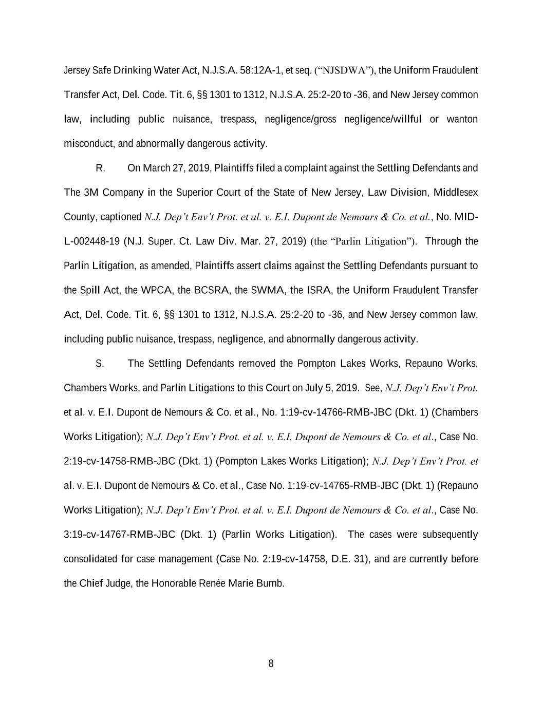 8 Jersey Safe Drinking Water Act, N.J.S.A. 58:12A-1, et seq. (“NJSDWA”), the Uniform Fraudulent Transfer Act, Del. Code. Tit. 6, §§ 1301 to 1312, N.J.S.A. 25:2-20 to -36, and New Jersey common law, including public nuisance, trespass, negligence/gross negligence/willful or wanton misconduct, and abnormally dangerous activity. R. On March 27, 2019, Plaintiffs filed a complaint against the Settling Defendants and The 3M Company in the Superior Court of the State of New Jersey, Law Division, Middlesex County, captioned N.J. Dep’t Env’t Prot. et al. v. E.I. Dupont de Nemours & Co. et al., No. MID- L-002448-19 (N.J. Super. Ct. Law Div. Mar. 27, 2019) (the “Parlin Litigation”). Through the Parlin Litigation, as amended, Plaintiffs assert claims against the Settling Defendants pursuant to the Spill Act, the WPCA, the BCSRA, the SWMA, the ISRA, the Uniform Fraudulent Transfer Act, Del. Code. Tit. 6, §§ 1301 to 1312, N.J.S.A. 25:2-20 to -36, and New Jersey common law, including public nuisance, trespass, negligence, and abnormally dangerous activity. S. The Settling Defendants removed the Pompton Lakes Works, Repauno Works, Chambers Works, and Parlin Litigations to this Court on July 5, 2019. See, N.J. Dep’t Env’t Prot. et al. v. E.I. Dupont de Nemours & Co. et al., No. 1:19-cv-14766-RMB-JBC (Dkt. 1) (Chambers Works Litigation); N.J. Dep’t Env’t Prot. et al. v. E.I. Dupont de Nemours & Co. et al., Case No. 2:19-cv-14758-RMB-JBC (Dkt. 1) (Pompton Lakes Works Litigation); N.J. Dep’t Env’t Prot. et al. v. E.I. Dupont de Nemours & Co. et al., Case No. 1:19-cv-14765-RMB-JBC (Dkt. 1) (Repauno Works Litigation); N.J. Dep’t Env’t Prot. et al. v. E.I. Dupont de Nemours & Co. et al., Case No. 3:19-cv-14767-RMB-JBC (Dkt. 1) (Parlin Works Litigation). The cases were subsequently consolidated for case management (Case No. 2:19-cv-14758, D.E. 31), and are currently before the Chief Judge, the Honorable Renée Marie Bumb.