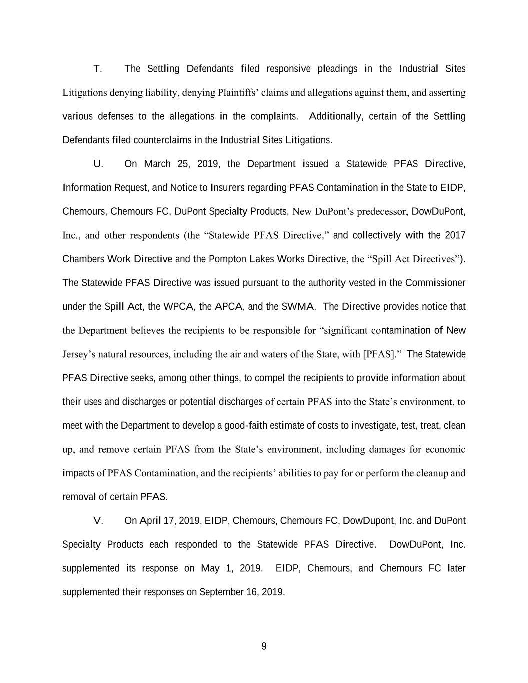 9 T. The Settling Defendants filed responsive pleadings in the Industrial Sites Litigations denying liability, denying Plaintiffs’ claims and allegations against them, and asserting various defenses to the allegations in the complaints. Additionally, certain of the Settling Defendants filed counterclaims in the Industrial Sites Litigations. U. On March 25, 2019, the Department issued a Statewide PFAS Directive, Information Request, and Notice to Insurers regarding PFAS Contamination in the State to EIDP, Chemours, Chemours FC, DuPont Specialty Products, New DuPont’s predecessor, DowDuPont, Inc., and other respondents (the “Statewide PFAS Directive,” and collectively with the 2017 Chambers Work Directive and the Pompton Lakes Works Directive, the “Spill Act Directives”). The Statewide PFAS Directive was issued pursuant to the authority vested in the Commissioner under the Spill Act, the WPCA, the APCA, and the SWMA. The Directive provides notice that the Department believes the recipients to be responsible for “significant contamination of New Jersey’s natural resources, including the air and waters of the State, with [PFAS].” The Statewide PFAS Directive seeks, among other things, to compel the recipients to provide information about their uses and discharges or potential discharges of certain PFAS into the State’s environment, to meet with the Department to develop a good-faith estimate of costs to investigate, test, treat, clean up, and remove certain PFAS from the State’s environment, including damages for economic impacts of PFAS Contamination, and the recipients’ abilities to pay for or perform the cleanup and removal of certain PFAS. V. On April 17, 2019, EIDP, Chemours, Chemours FC, DowDupont, Inc. and DuPont Specialty Products each responded to the Statewide PFAS Directive. DowDuPont, Inc. supplemented its response on May 1, 2019. EIDP, Chemours, and Chemours FC later supplemented their responses on September 16, 2019.