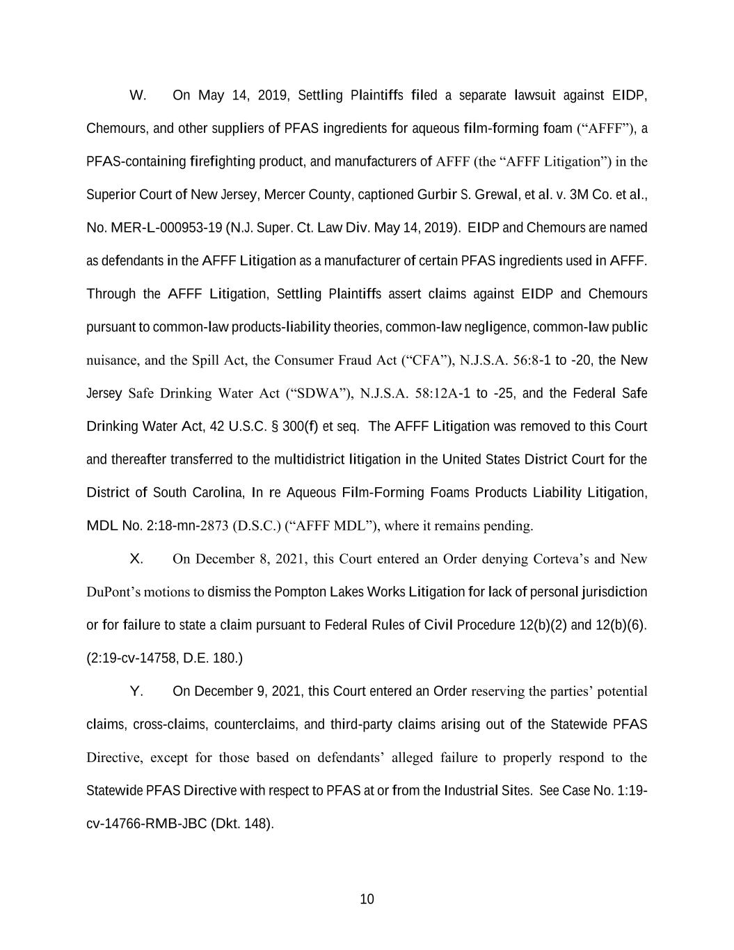 10 W. On May 14, 2019, Settling Plaintiffs filed a separate lawsuit against EIDP, Chemours, and other suppliers of PFAS ingredients for aqueous film-forming foam (“AFFF”), a PFAS-containing firefighting product, and manufacturers of AFFF (the “AFFF Litigation”) in the Superior Court of New Jersey, Mercer County, captioned Gurbir S. Grewal, et al. v. 3M Co. et al., No. MER-L-000953-19 (N.J. Super. Ct. Law Div. May 14, 2019). EIDP and Chemours are named as defendants in the AFFF Litigation as a manufacturer of certain PFAS ingredients used in AFFF. Through the AFFF Litigation, Settling Plaintiffs assert claims against EIDP and Chemours pursuant to common-law products-liability theories, common-law negligence, common-law public nuisance, and the Spill Act, the Consumer Fraud Act (“CFA”), N.J.S.A. 56:8-1 to -20, the New Jersey Safe Drinking Water Act (“SDWA”), N.J.S.A. 58:12A-1 to -25, and the Federal Safe Drinking Water Act, 42 U.S.C. § 300(f) et seq. The AFFF Litigation was removed to this Court and thereafter transferred to the multidistrict litigation in the United States District Court for the District of South Carolina, In re Aqueous Film-Forming Foams Products Liability Litigation, MDL No. 2:18-mn-2873 (D.S.C.) (“AFFF MDL”), where it remains pending. X. On December 8, 2021, this Court entered an Order denying Corteva’s and New DuPont’s motions to dismiss the Pompton Lakes Works Litigation for lack of personal jurisdiction or for failure to state a claim pursuant to Federal Rules of Civil Procedure 12(b)(2) and 12(b)(6). (2:19-cv-14758, D.E. 180.) Y. On December 9, 2021, this Court entered an Order reserving the parties’ potential claims, cross-claims, counterclaims, and third-party claims arising out of the Statewide PFAS Directive, except for those based on defendants’ alleged failure to properly respond to the Statewide PFAS Directive with respect to PFAS at or from the Industrial Sites. See Case No. 1:19- cv-14766-RMB-JBC (Dkt. 148).