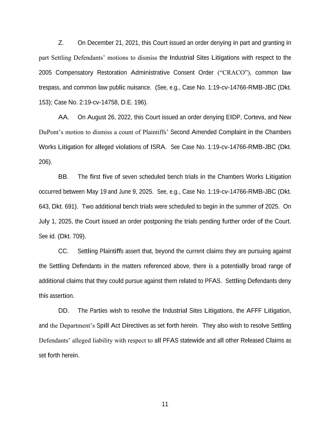 11 Z. On December 21, 2021, this Court issued an order denying in part and granting in part Settling Defendants’ motions to dismiss the Industrial Sites Litigations with respect to the 2005 Compensatory Restoration Administrative Consent Order (“CRACO”), common law trespass, and common law public nuisance. (See, e.g., Case No. 1:19-cv-14766-RMB-JBC (Dkt. 153); Case No. 2:19-cv-14758, D.E. 196). AA. On August 26, 2022, this Court issued an order denying EIDP, Corteva, and New DuPont’s motion to dismiss a count of Plaintiffs’ Second Amended Complaint in the Chambers Works Litigation for alleged violations of ISRA. See Case No. 1:19-cv-14766-RMB-JBC (Dkt. 206). BB. The first five of seven scheduled bench trials in the Chambers Works Litigation occurred between May 19 and June 9, 2025. See, e.g., Case No. 1:19-cv-14766-RMB-JBC (Dkt. 643, Dkt. 691). Two additional bench trials were scheduled to begin in the summer of 2025. On July 1, 2025, the Court issued an order postponing the trials pending further order of the Court. See id. (Dkt. 709). CC. Settling Plaintiffs assert that, beyond the current claims they are pursuing against the Settling Defendants in the matters referenced above, there is a potentially broad range of additional claims that they could pursue against them related to PFAS. Settling Defendants deny this assertion. DD. The Parties wish to resolve the Industrial Sites Litigations, the AFFF Litigation, and the Department’s Spill Act Directives as set forth herein. They also wish to resolve Settling Defendants’ alleged liability with respect to all PFAS statewide and all other Released Claims as set forth herein.