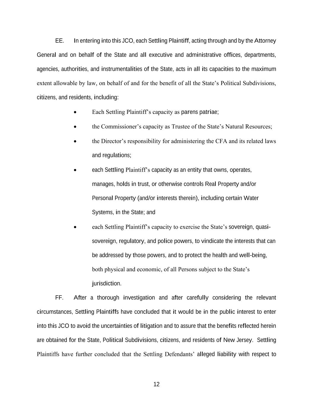 12 EE. In entering into this JCO, each Settling Plaintiff, acting through and by the Attorney General and on behalf of the State and all executive and administrative offices, departments, agencies, authorities, and instrumentalities of the State, acts in all its capacities to the maximum extent allowable by law, on behalf of and for the benefit of all the State’s Political Subdivisions, citizens, and residents, including: • Each Settling Plaintiff’s capacity as parens patriae; • the Commissioner’s capacity as Trustee of the State’s Natural Resources; • the Director’s responsibility for administering the CFA and its related laws and regulations; • each Settling Plaintiff’s capacity as an entity that owns, operates, manages, holds in trust, or otherwise controls Real Property and/or Personal Property (and/or interests therein), including certain Water Systems, in the State; and • each Settling Plaintiff’s capacity to exercise the State’s sovereign, quasi- sovereign, regulatory, and police powers, to vindicate the interests that can be addressed by those powers, and to protect the health and well-being, both physical and economic, of all Persons subject to the State’s jurisdiction. FF. After a thorough investigation and after carefully considering the relevant circumstances, Settling Plaintiffs have concluded that it would be in the public interest to enter into this JCO to avoid the uncertainties of litigation and to assure that the benefits reflected herein are obtained for the State, Political Subdivisions, citizens, and residents of New Jersey. Settling Plaintiffs have further concluded that the Settling Defendants’ alleged liability with respect to