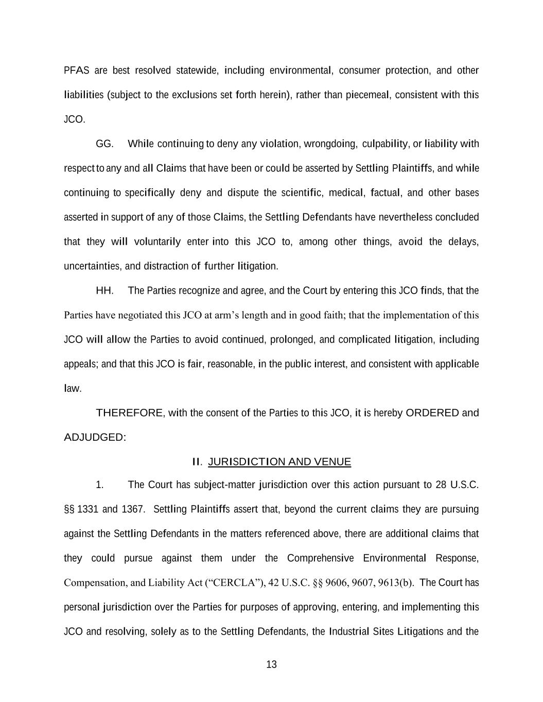 13 PFAS are best resolved statewide, including environmental, consumer protection, and other liabilities (subject to the exclusions set forth herein), rather than piecemeal, consistent with this JCO. GG. While continuing to deny any violation, wrongdoing, culpability, or liability with respect to any and all Claims that have been or could be asserted by Settling Plaintiffs, and while continuing to specifically deny and dispute the scientific, medical, factual, and other bases asserted in support of any of those Claims, the Settling Defendants have nevertheless concluded that they will voluntarily enter into this JCO to, among other things, avoid the delays, uncertainties, and distraction of further litigation. HH. The Parties recognize and agree, and the Court by entering this JCO finds, that the Parties have negotiated this JCO at arm’s length and in good faith; that the implementation of this JCO will allow the Parties to avoid continued, prolonged, and complicated litigation, including appeals; and that this JCO is fair, reasonable, in the public interest, and consistent with applicable law. THEREFORE, with the consent of the Parties to this JCO, it is hereby ORDERED and ADJUDGED: II. JURISDICTION AND VENUE 1. The Court has subject-matter jurisdiction over this action pursuant to 28 U.S.C. §§ 1331 and 1367. Settling Plaintiffs assert that, beyond the current claims they are pursuing against the Settling Defendants in the matters referenced above, there are additional claims that they could pursue against them under the Comprehensive Environmental Response, Compensation, and Liability Act (“CERCLA”), 42 U.S.C. §§ 9606, 9607, 9613(b). The Court has personal jurisdiction over the Parties for purposes of approving, entering, and implementing this JCO and resolving, solely as to the Settling Defendants, the Industrial Sites Litigations and the