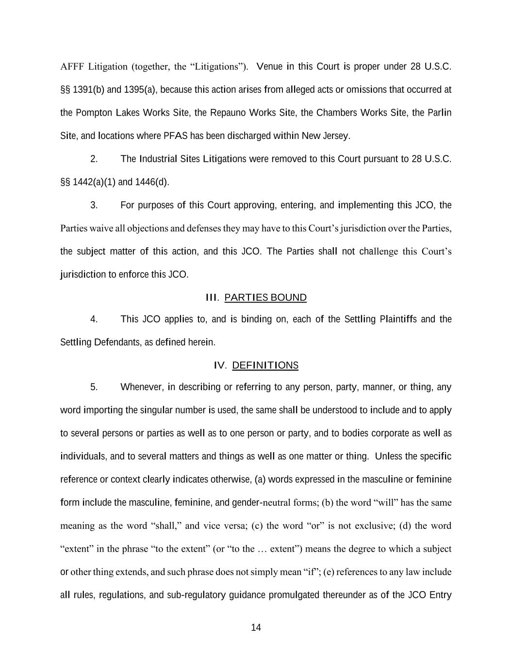 14 AFFF Litigation (together, the “Litigations”). Venue in this Court is proper under 28 U.S.C. §§ 1391(b) and 1395(a), because this action arises from alleged acts or omissions that occurred at the Pompton Lakes Works Site, the Repauno Works Site, the Chambers Works Site, the Parlin Site, and locations where PFAS has been discharged within New Jersey. 2. The Industrial Sites Litigations were removed to this Court pursuant to 28 U.S.C. §§ 1442(a)(1) and 1446(d). 3. For purposes of this Court approving, entering, and implementing this JCO, the Parties waive all objections and defenses they may have to this Court’s jurisdiction over the Parties, the subject matter of this action, and this JCO. The Parties shall not challenge this Court’s jurisdiction to enforce this JCO. III. PARTIES BOUND 4. This JCO applies to, and is binding on, each of the Settling Plaintiffs and the Settling Defendants, as defined herein. IV. DEFINITIONS 5. Whenever, in describing or referring to any person, party, manner, or thing, any word importing the singular number is used, the same shall be understood to include and to apply to several persons or parties as well as to one person or party, and to bodies corporate as well as individuals, and to several matters and things as well as one matter or thing. Unless the specific reference or context clearly indicates otherwise, (a) words expressed in the masculine or feminine form include the masculine, feminine, and gender-neutral forms; (b) the word “will” has the same meaning as the word “shall,” and vice versa; (c) the word “or” is not exclusive; (d) the word “extent” in the phrase “to the extent” (or “to the … extent”) means the degree to which a subject or other thing extends, and such phrase does not simply mean “if”; (e) references to any law include all rules, regulations, and sub-regulatory guidance promulgated thereunder as of the JCO Entry