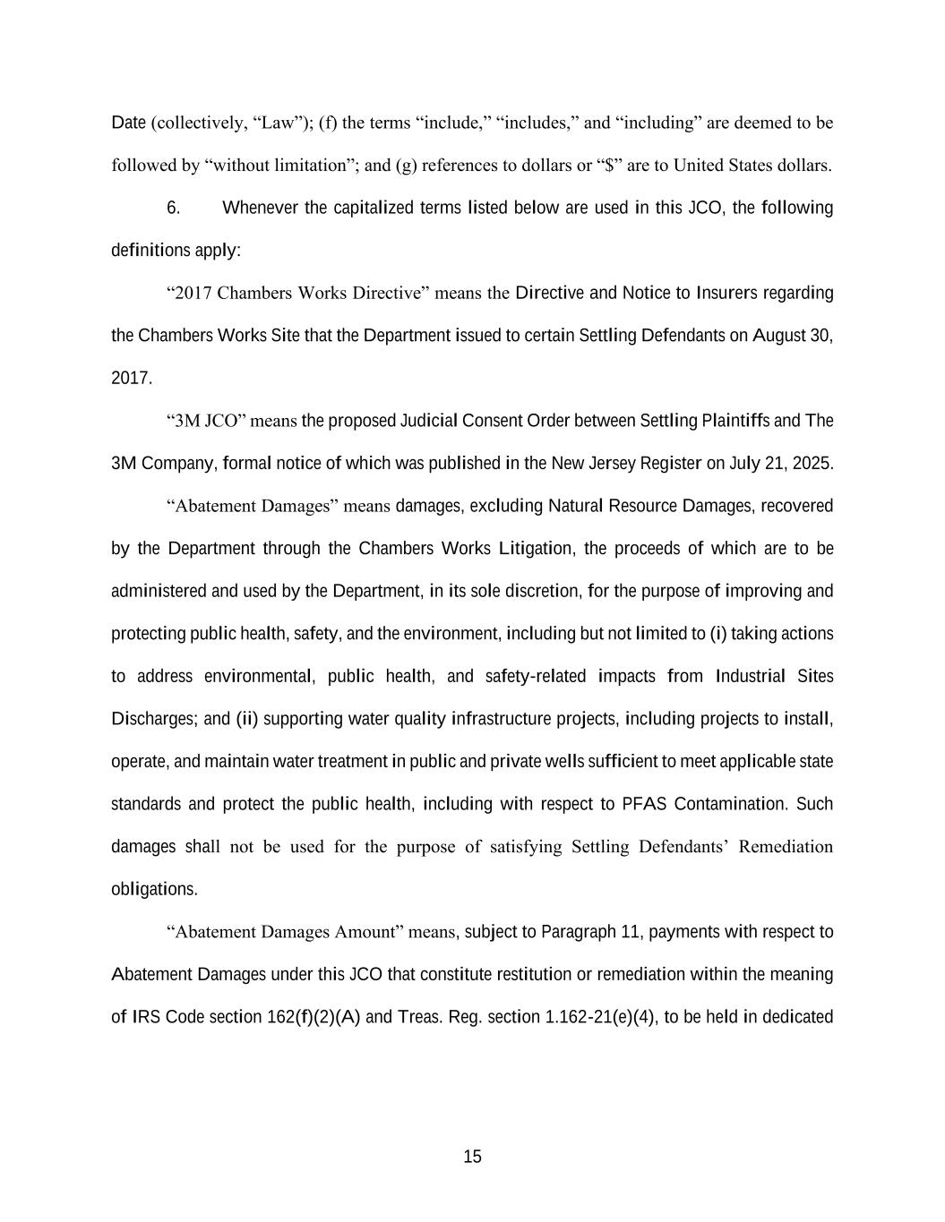 15 Date (collectively, “Law”); (f) the terms “include,” “includes,” and “including” are deemed to be followed by “without limitation”; and (g) references to dollars or “$” are to United States dollars. 6. Whenever the capitalized terms listed below are used in this JCO, the following definitions apply: “2017 Chambers Works Directive” means the Directive and Notice to Insurers regarding the Chambers Works Site that the Department issued to certain Settling Defendants on August 30, 2017. “3M JCO” means the proposed Judicial Consent Order between Settling Plaintiffs and The 3M Company, formal notice of which was published in the New Jersey Register on July 21, 2025. “Abatement Damages” means damages, excluding Natural Resource Damages, recovered by the Department through the Chambers Works Litigation, the proceeds of which are to be administered and used by the Department, in its sole discretion, for the purpose of improving and protecting public health, safety, and the environment, including but not limited to (i) taking actions to address environmental, public health, and safety-related impacts from Industrial Sites Discharges; and (ii) supporting water quality infrastructure projects, including projects to install, operate, and maintain water treatment in public and private wells sufficient to meet applicable state standards and protect the public health, including with respect to PFAS Contamination. Such damages shall not be used for the purpose of satisfying Settling Defendants’ Remediation obligations. “Abatement Damages Amount” means, subject to Paragraph 11, payments with respect to Abatement Damages under this JCO that constitute restitution or remediation within the meaning of IRS Code section 162(f)(2)(A) and Treas. Reg. section 1.162-21(e)(4), to be held in dedicated
