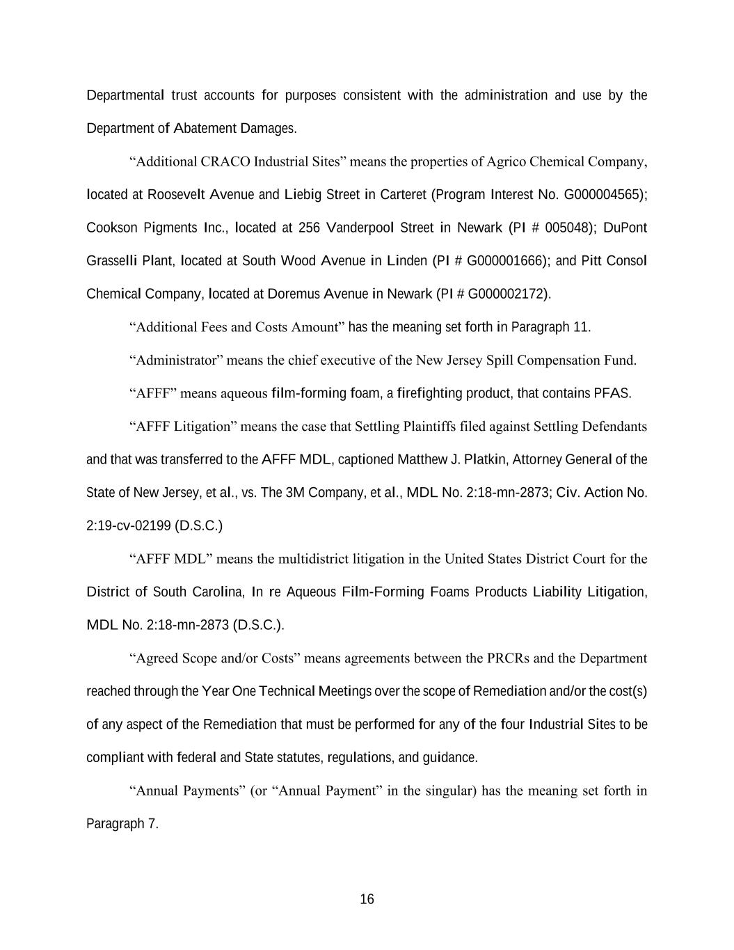 16 Departmental trust accounts for purposes consistent with the administration and use by the Department of Abatement Damages. “Additional CRACO Industrial Sites” means the properties of Agrico Chemical Company, located at Roosevelt Avenue and Liebig Street in Carteret (Program Interest No. G000004565); Cookson Pigments Inc., located at 256 Vanderpool Street in Newark (PI # 005048); DuPont Grasselli Plant, located at South Wood Avenue in Linden (PI # G000001666); and Pitt Consol Chemical Company, located at Doremus Avenue in Newark (PI # G000002172). “Additional Fees and Costs Amount” has the meaning set forth in Paragraph 11. “Administrator” means the chief executive of the New Jersey Spill Compensation Fund. “AFFF” means aqueous film-forming foam, a firefighting product, that contains PFAS. “AFFF Litigation” means the case that Settling Plaintiffs filed against Settling Defendants and that was transferred to the AFFF MDL, captioned Matthew J. Platkin, Attorney General of the State of New Jersey, et al., vs. The 3M Company, et al., MDL No. 2:18-mn-2873; Civ. Action No. 2:19-cv-02199 (D.S.C.) “AFFF MDL” means the multidistrict litigation in the United States District Court for the District of South Carolina, In re Aqueous Film-Forming Foams Products Liability Litigation, MDL No. 2:18-mn-2873 (D.S.C.). “Agreed Scope and/or Costs” means agreements between the PRCRs and the Department reached through the Year One Technical Meetings over the scope of Remediation and/or the cost(s) of any aspect of the Remediation that must be performed for any of the four Industrial Sites to be compliant with federal and State statutes, regulations, and guidance. “Annual Payments” (or “Annual Payment” in the singular) has the meaning set forth in Paragraph 7.