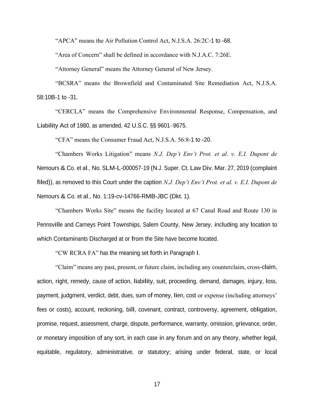 17 “APCA” means the Air Pollution Control Act, N.J.S.A. 26:2C-1 to -68. “Area of Concern” shall be defined in accordance with N.J.A.C. 7:26E. “Attorney General” means the Attorney General of New Jersey. “BCSRA” means the Brownfield and Contaminated Site Remediation Act, N.J.S.A. 58:10B-1 to -31. “CERCLA” means the Comprehensive Environmental Response, Compensation, and Liability Act of 1980, as amended, 42 U.S.C. §§ 9601–9675. “CFA” means the Consumer Fraud Act, N.J.S.A. 56:8-1 to -20. “Chambers Works Litigation” means N.J. Dep’t Env’t Prot. et al. v. E.I. Dupont de Nemours & Co. et al., No. SLM-L-000057-19 (N.J. Super. Ct. Law Div. Mar. 27, 2019 (complaint filed)), as removed to this Court under the caption N.J. Dep’t Env’t Prot. et al. v. E.I. Dupont de Nemours & Co. et al., No. 1:19-cv-14766-RMB-JBC (Dkt. 1). “Chambers Works Site” means the facility located at 67 Canal Road and Route 130 in Pennsville and Carneys Point Townships, Salem County, New Jersey, including any location to which Contaminants Discharged at or from the Site have become located. “CW RCRA FA” has the meaning set forth in Paragraph I. “Claim” means any past, present, or future claim, including any counterclaim, cross-claim, action, right, remedy, cause of action, liability, suit, proceeding, demand, damages, injury, loss, payment, judgment, verdict, debt, dues, sum of money, lien, cost or expense (including attorneys’ fees or costs), account, reckoning, bill, covenant, contract, controversy, agreement, obligation, promise, request, assessment, charge, dispute, performance, warranty, omission, grievance, order, or monetary imposition of any sort, in each case in any forum and on any theory, whether legal, equitable, regulatory, administrative, or statutory; arising under federal, state, or local