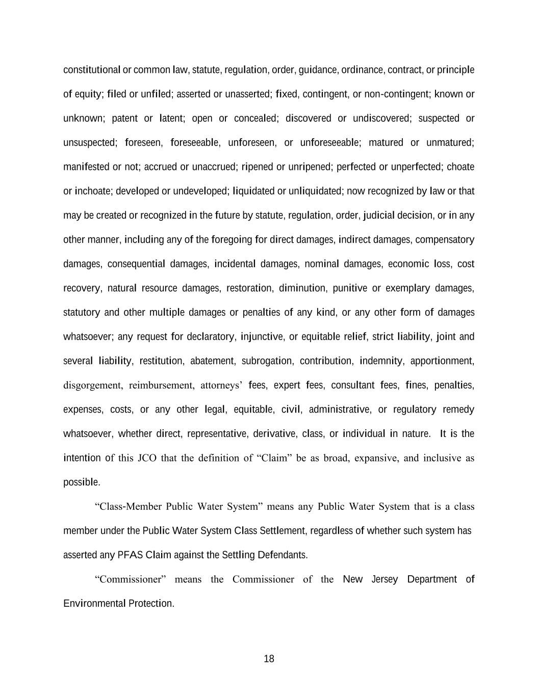 18 constitutional or common law, statute, regulation, order, guidance, ordinance, contract, or principle of equity; filed or unfiled; asserted or unasserted; fixed, contingent, or non-contingent; known or unknown; patent or latent; open or concealed; discovered or undiscovered; suspected or unsuspected; foreseen, foreseeable, unforeseen, or unforeseeable; matured or unmatured; manifested or not; accrued or unaccrued; ripened or unripened; perfected or unperfected; choate or inchoate; developed or undeveloped; liquidated or unliquidated; now recognized by law or that may be created or recognized in the future by statute, regulation, order, judicial decision, or in any other manner, including any of the foregoing for direct damages, indirect damages, compensatory damages, consequential damages, incidental damages, nominal damages, economic loss, cost recovery, natural resource damages, restoration, diminution, punitive or exemplary damages, statutory and other multiple damages or penalties of any kind, or any other form of damages whatsoever; any request for declaratory, injunctive, or equitable relief, strict liability, joint and several liability, restitution, abatement, subrogation, contribution, indemnity, apportionment, disgorgement, reimbursement, attorneys’ fees, expert fees, consultant fees, fines, penalties, expenses, costs, or any other legal, equitable, civil, administrative, or regulatory remedy whatsoever, whether direct, representative, derivative, class, or individual in nature. It is the intention of this JCO that the definition of “Claim” be as broad, expansive, and inclusive as possible. “Class-Member Public Water System” means any Public Water System that is a class member under the Public Water System Class Settlement, regardless of whether such system has asserted any PFAS Claim against the Settling Defendants. “Commissioner” means the Commissioner of the New Jersey Department of Environmental Protection.