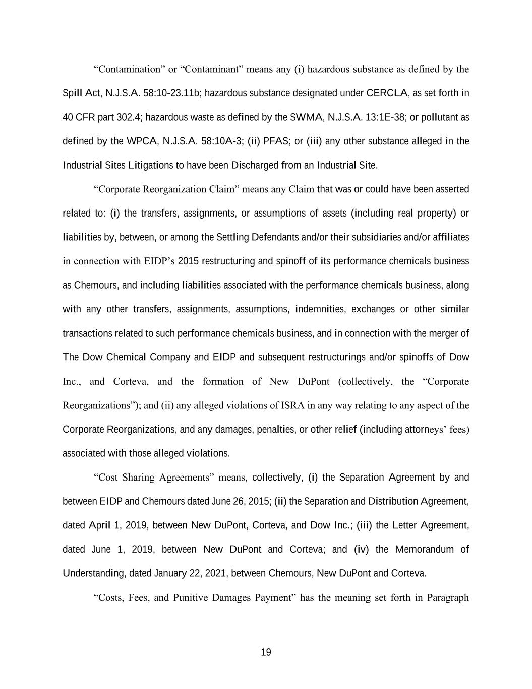 19 “Contamination” or “Contaminant” means any (i) hazardous substance as defined by the Spill Act, N.J.S.A. 58:10-23.11b; hazardous substance designated under CERCLA, as set forth in 40 CFR part 302.4; hazardous waste as defined by the SWMA, N.J.S.A. 13:1E-38; or pollutant as defined by the WPCA, N.J.S.A. 58:10A-3; (ii) PFAS; or (iii) any other substance alleged in the Industrial Sites Litigations to have been Discharged from an Industrial Site. “Corporate Reorganization Claim” means any Claim that was or could have been asserted related to: (i) the transfers, assignments, or assumptions of assets (including real property) or liabilities by, between, or among the Settling Defendants and/or their subsidiaries and/or affiliates in connection with EIDP’s 2015 restructuring and spinoff of its performance chemicals business as Chemours, and including liabilities associated with the performance chemicals business, along with any other transfers, assignments, assumptions, indemnities, exchanges or other similar transactions related to such performance chemicals business, and in connection with the merger of The Dow Chemical Company and EIDP and subsequent restructurings and/or spinoffs of Dow Inc., and Corteva, and the formation of New DuPont (collectively, the “Corporate Reorganizations”); and (ii) any alleged violations of ISRA in any way relating to any aspect of the Corporate Reorganizations, and any damages, penalties, or other relief (including attorneys’ fees) associated with those alleged violations. “Cost Sharing Agreements” means, collectively, (i) the Separation Agreement by and between EIDP and Chemours dated June 26, 2015; (ii) the Separation and Distribution Agreement, dated April 1, 2019, between New DuPont, Corteva, and Dow Inc.; (iii) the Letter Agreement, dated June 1, 2019, between New DuPont and Corteva; and (iv) the Memorandum of Understanding, dated January 22, 2021, between Chemours, New DuPont and Corteva. “Costs, Fees, and Punitive Damages Payment” has the meaning set forth in Paragraph