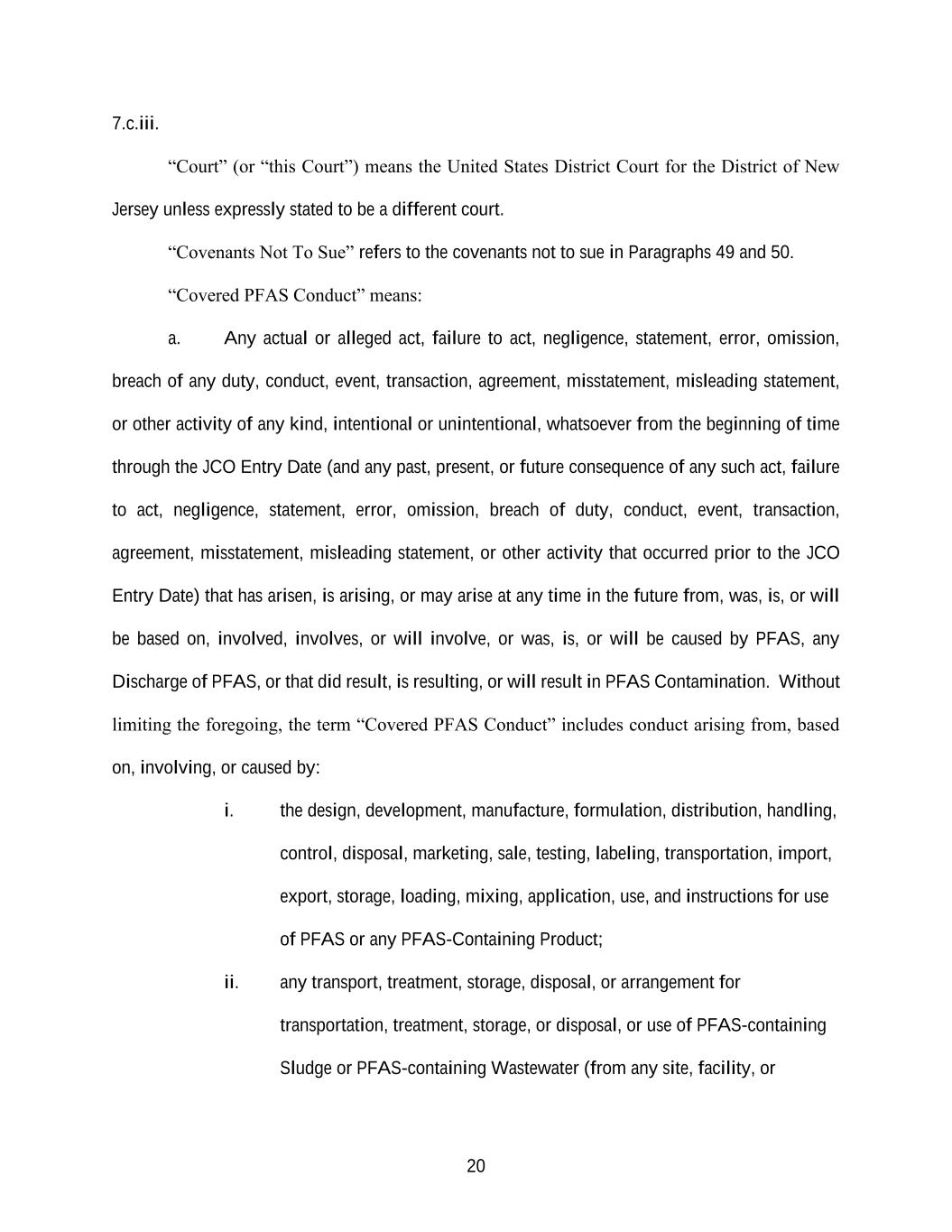 20 7.c.iii. “Court” (or “this Court”) means the United States District Court for the District of New Jersey unless expressly stated to be a different court. “Covenants Not To Sue” refers to the covenants not to sue in Paragraphs 49 and 50. “Covered PFAS Conduct” means: a. Any actual or alleged act, failure to act, negligence, statement, error, omission, breach of any duty, conduct, event, transaction, agreement, misstatement, misleading statement, or other activity of any kind, intentional or unintentional, whatsoever from the beginning of time through the JCO Entry Date (and any past, present, or future consequence of any such act, failure to act, negligence, statement, error, omission, breach of duty, conduct, event, transaction, agreement, misstatement, misleading statement, or other activity that occurred prior to the JCO Entry Date) that has arisen, is arising, or may arise at any time in the future from, was, is, or will be based on, involved, involves, or will involve, or was, is, or will be caused by PFAS, any Discharge of PFAS, or that did result, is resulting, or will result in PFAS Contamination. Without limiting the foregoing, the term “Covered PFAS Conduct” includes conduct arising from, based on, involving, or caused by: i. the design, development, manufacture, formulation, distribution, handling, control, disposal, marketing, sale, testing, labeling, transportation, import, export, storage, loading, mixing, application, use, and instructions for use of PFAS or any PFAS-Containing Product; ii. any transport, treatment, storage, disposal, or arrangement for transportation, treatment, storage, or disposal, or use of PFAS-containing Sludge or PFAS-containing Wastewater (from any site, facility, or