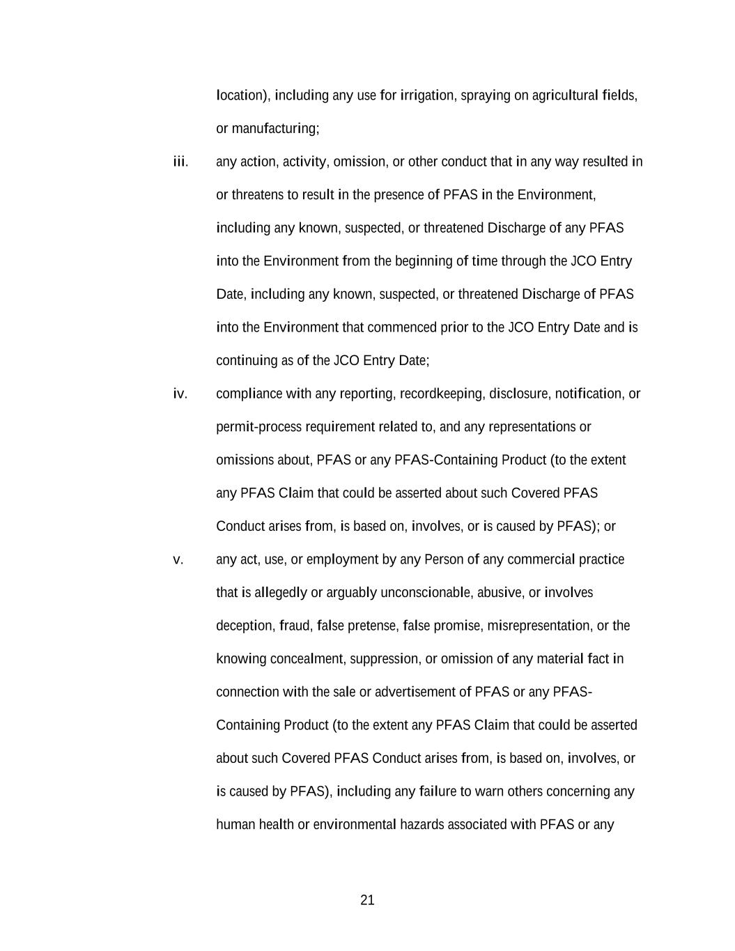 21 location), including any use for irrigation, spraying on agricultural fields, or manufacturing; iii. any action, activity, omission, or other conduct that in any way resulted in or threatens to result in the presence of PFAS in the Environment, including any known, suspected, or threatened Discharge of any PFAS into the Environment from the beginning of time through the JCO Entry Date, including any known, suspected, or threatened Discharge of PFAS into the Environment that commenced prior to the JCO Entry Date and is continuing as of the JCO Entry Date; iv. compliance with any reporting, recordkeeping, disclosure, notification, or permit-process requirement related to, and any representations or omissions about, PFAS or any PFAS-Containing Product (to the extent any PFAS Claim that could be asserted about such Covered PFAS Conduct arises from, is based on, involves, or is caused by PFAS); or v. any act, use, or employment by any Person of any commercial practice that is allegedly or arguably unconscionable, abusive, or involves deception, fraud, false pretense, false promise, misrepresentation, or the knowing concealment, suppression, or omission of any material fact in connection with the sale or advertisement of PFAS or any PFAS- Containing Product (to the extent any PFAS Claim that could be asserted about such Covered PFAS Conduct arises from, is based on, involves, or is caused by PFAS), including any failure to warn others concerning any human health or environmental hazards associated with PFAS or any