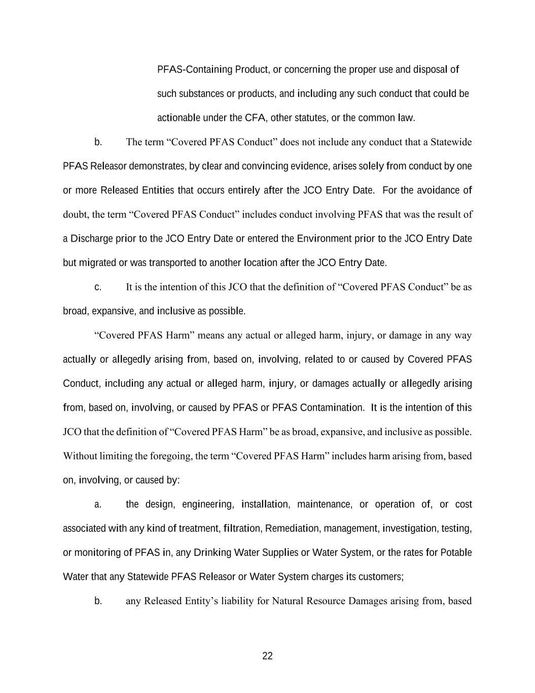 22 PFAS-Containing Product, or concerning the proper use and disposal of such substances or products, and including any such conduct that could be actionable under the CFA, other statutes, or the common law. b. The term “Covered PFAS Conduct” does not include any conduct that a Statewide PFAS Releasor demonstrates, by clear and convincing evidence, arises solely from conduct by one or more Released Entities that occurs entirely after the JCO Entry Date. For the avoidance of doubt, the term “Covered PFAS Conduct” includes conduct involving PFAS that was the result of a Discharge prior to the JCO Entry Date or entered the Environment prior to the JCO Entry Date but migrated or was transported to another location after the JCO Entry Date. c. It is the intention of this JCO that the definition of “Covered PFAS Conduct” be as broad, expansive, and inclusive as possible. “Covered PFAS Harm” means any actual or alleged harm, injury, or damage in any way actually or allegedly arising from, based on, involving, related to or caused by Covered PFAS Conduct, including any actual or alleged harm, injury, or damages actually or allegedly arising from, based on, involving, or caused by PFAS or PFAS Contamination. It is the intention of this JCO that the definition of “Covered PFAS Harm” be as broad, expansive, and inclusive as possible. Without limiting the foregoing, the term “Covered PFAS Harm” includes harm arising from, based on, involving, or caused by: a. the design, engineering, installation, maintenance, or operation of, or cost associated with any kind of treatment, filtration, Remediation, management, investigation, testing, or monitoring of PFAS in, any Drinking Water Supplies or Water System, or the rates for Potable Water that any Statewide PFAS Releasor or Water System charges its customers; b. any Released Entity’s liability for Natural Resource Damages arising from, based
