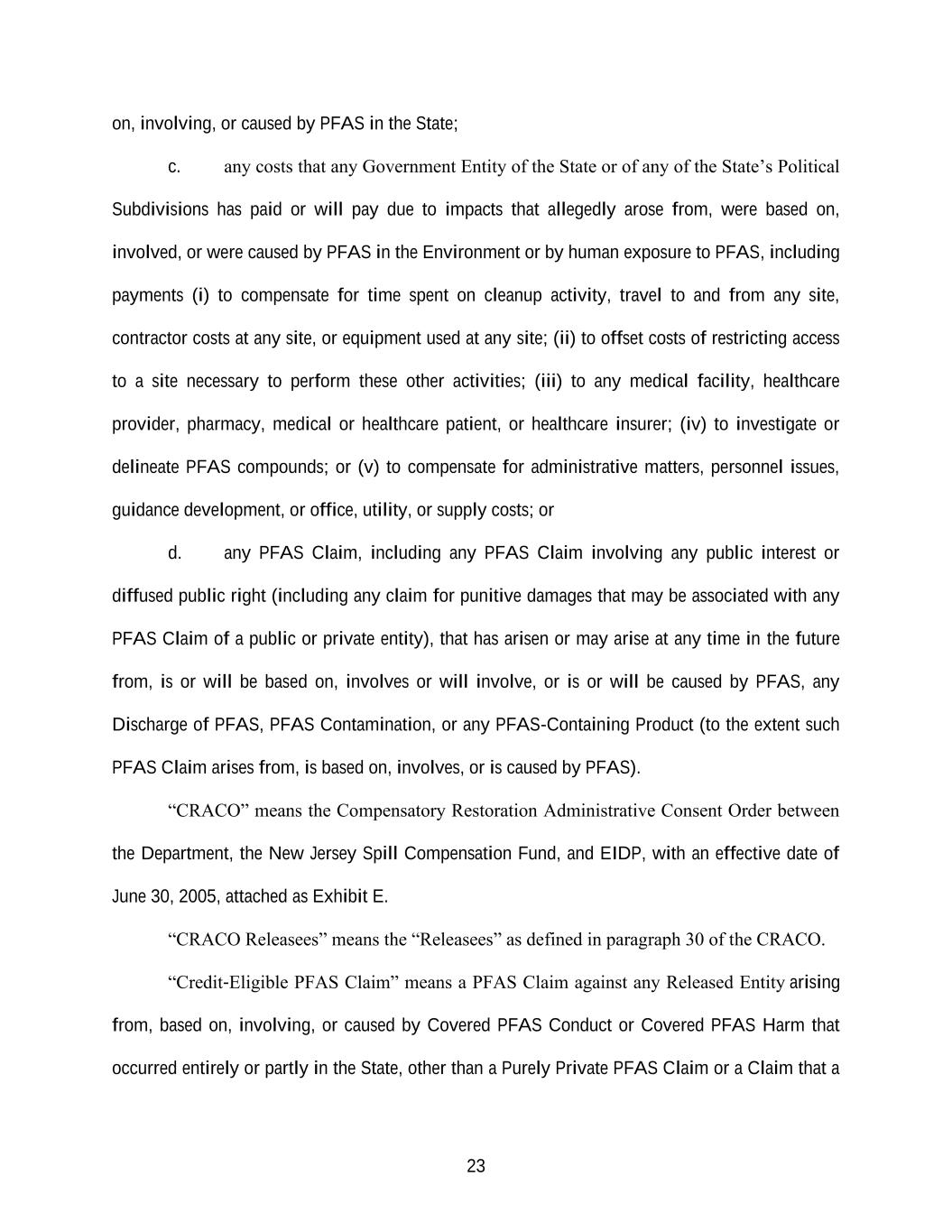23 on, involving, or caused by PFAS in the State; c. any costs that any Government Entity of the State or of any of the State’s Political Subdivisions has paid or will pay due to impacts that allegedly arose from, were based on, involved, or were caused by PFAS in the Environment or by human exposure to PFAS, including payments (i) to compensate for time spent on cleanup activity, travel to and from any site, contractor costs at any site, or equipment used at any site; (ii) to offset costs of restricting access to a site necessary to perform these other activities; (iii) to any medical facility, healthcare provider, pharmacy, medical or healthcare patient, or healthcare insurer; (iv) to investigate or delineate PFAS compounds; or (v) to compensate for administrative matters, personnel issues, guidance development, or office, utility, or supply costs; or d. any PFAS Claim, including any PFAS Claim involving any public interest or diffused public right (including any claim for punitive damages that may be associated with any PFAS Claim of a public or private entity), that has arisen or may arise at any time in the future from, is or will be based on, involves or will involve, or is or will be caused by PFAS, any Discharge of PFAS, PFAS Contamination, or any PFAS-Containing Product (to the extent such PFAS Claim arises from, is based on, involves, or is caused by PFAS). “CRACO” means the Compensatory Restoration Administrative Consent Order between the Department, the New Jersey Spill Compensation Fund, and EIDP, with an effective date of June 30, 2005, attached as Exhibit E. “CRACO Releasees” means the “Releasees” as defined in paragraph 30 of the CRACO. “Credit-Eligible PFAS Claim” means a PFAS Claim against any Released Entity arising from, based on, involving, or caused by Covered PFAS Conduct or Covered PFAS Harm that occurred entirely or partly in the State, other than a Purely Private PFAS Claim or a Claim that a
