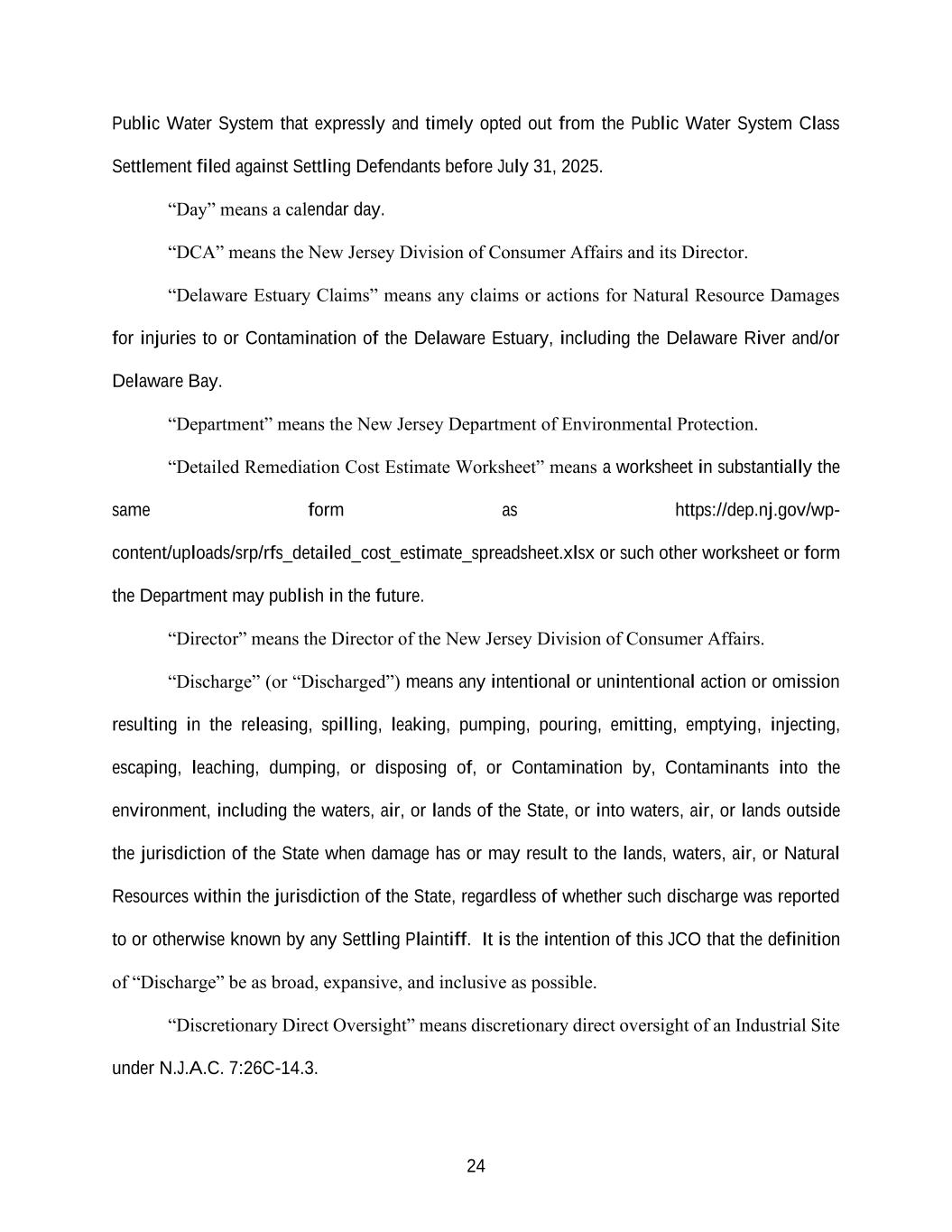 24 Public Water System that expressly and timely opted out from the Public Water System Class Settlement filed against Settling Defendants before July 31, 2025. “Day” means a calendar day. “DCA” means the New Jersey Division of Consumer Affairs and its Director. “Delaware Estuary Claims” means any claims or actions for Natural Resource Damages for injuries to or Contamination of the Delaware Estuary, including the Delaware River and/or Delaware Bay. “Department” means the New Jersey Department of Environmental Protection. “Detailed Remediation Cost Estimate Worksheet” means a worksheet in substantially the same form as https://dep.nj.gov/wp- content/uploads/srp/rfs_detailed_cost_estimate_spreadsheet.xlsx or such other worksheet or form the Department may publish in the future. “Director” means the Director of the New Jersey Division of Consumer Affairs. “Discharge” (or “Discharged”) means any intentional or unintentional action or omission resulting in the releasing, spilling, leaking, pumping, pouring, emitting, emptying, injecting, escaping, leaching, dumping, or disposing of, or Contamination by, Contaminants into the environment, including the waters, air, or lands of the State, or into waters, air, or lands outside the jurisdiction of the State when damage has or may result to the lands, waters, air, or Natural Resources within the jurisdiction of the State, regardless of whether such discharge was reported to or otherwise known by any Settling Plaintiff. It is the intention of this JCO that the definition of “Discharge” be as broad, expansive, and inclusive as possible. “Discretionary Direct Oversight” means discretionary direct oversight of an Industrial Site under N.J.A.C. 7:26C-14.3.