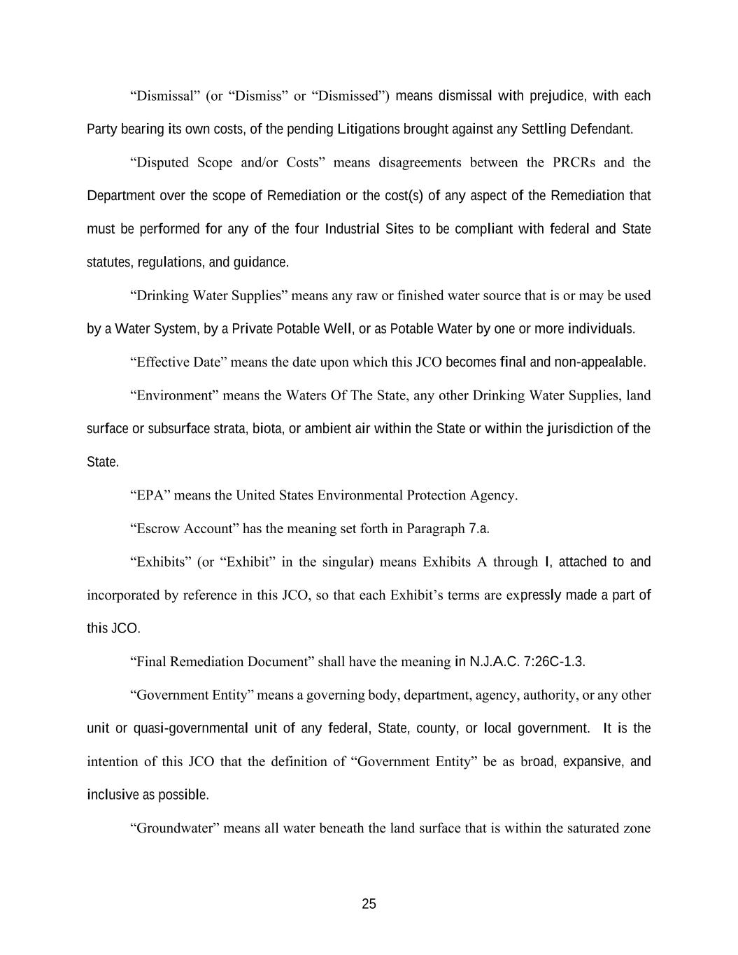 25 “Dismissal” (or “Dismiss” or “Dismissed”) means dismissal with prejudice, with each Party bearing its own costs, of the pending Litigations brought against any Settling Defendant. “Disputed Scope and/or Costs” means disagreements between the PRCRs and the Department over the scope of Remediation or the cost(s) of any aspect of the Remediation that must be performed for any of the four Industrial Sites to be compliant with federal and State statutes, regulations, and guidance. “Drinking Water Supplies” means any raw or finished water source that is or may be used by a Water System, by a Private Potable Well, or as Potable Water by one or more individuals. “Effective Date” means the date upon which this JCO becomes final and non-appealable. “Environment” means the Waters Of The State, any other Drinking Water Supplies, land surface or subsurface strata, biota, or ambient air within the State or within the jurisdiction of the State. “EPA” means the United States Environmental Protection Agency. “Escrow Account” has the meaning set forth in Paragraph 7.a. “Exhibits” (or “Exhibit” in the singular) means Exhibits A through I, attached to and incorporated by reference in this JCO, so that each Exhibit’s terms are expressly made a part of this JCO. “Final Remediation Document” shall have the meaning in N.J.A.C. 7:26C-1.3. “Government Entity” means a governing body, department, agency, authority, or any other unit or quasi-governmental unit of any federal, State, county, or local government. It is the intention of this JCO that the definition of “Government Entity” be as broad, expansive, and inclusive as possible. “Groundwater” means all water beneath the land surface that is within the saturated zone