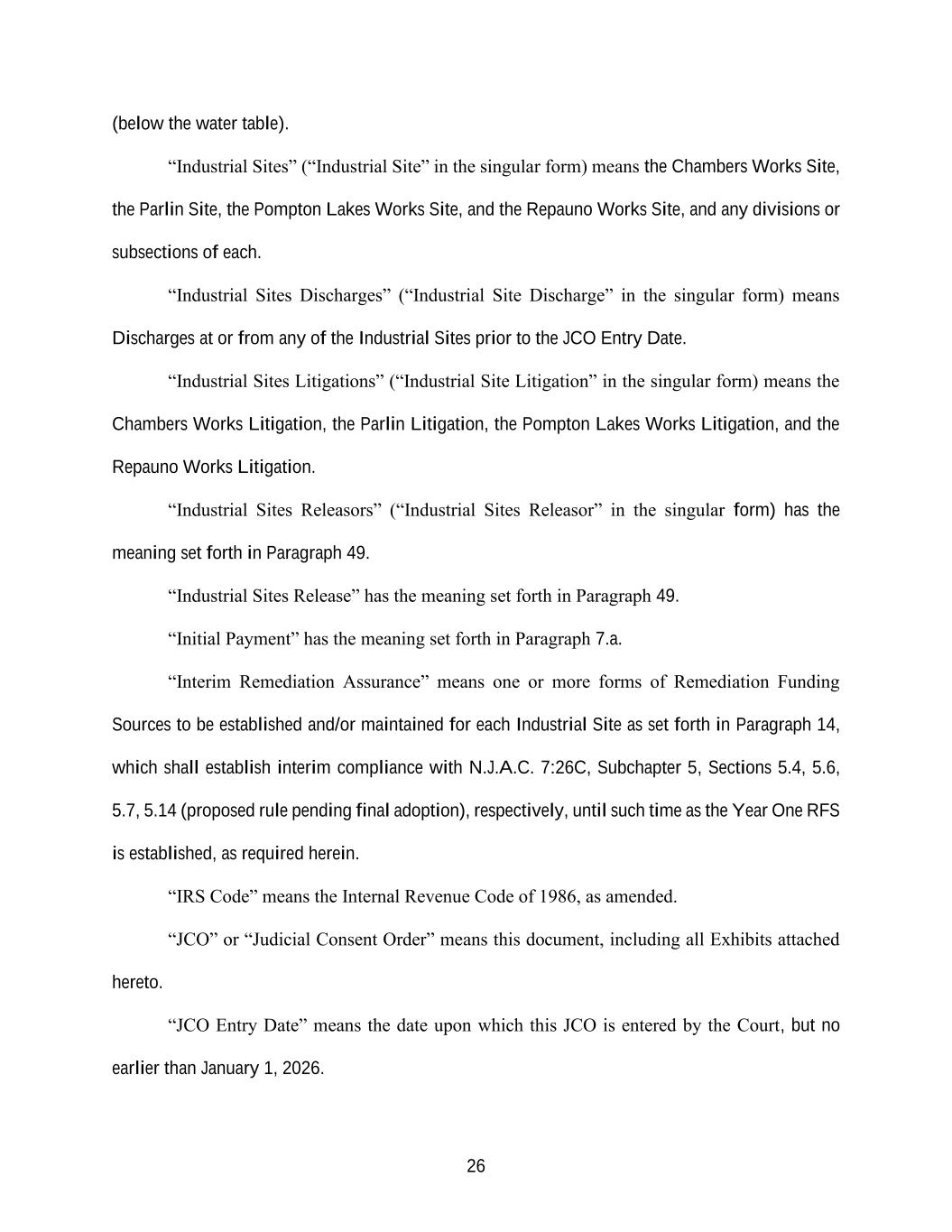 26 (below the water table). “Industrial Sites” (“Industrial Site” in the singular form) means the Chambers Works Site, the Parlin Site, the Pompton Lakes Works Site, and the Repauno Works Site, and any divisions or subsections of each. “Industrial Sites Discharges” (“Industrial Site Discharge” in the singular form) means Discharges at or from any of the Industrial Sites prior to the JCO Entry Date. “Industrial Sites Litigations” (“Industrial Site Litigation” in the singular form) means the Chambers Works Litigation, the Parlin Litigation, the Pompton Lakes Works Litigation, and the Repauno Works Litigation. “Industrial Sites Releasors” (“Industrial Sites Releasor” in the singular form) has the meaning set forth in Paragraph 49. “Industrial Sites Release” has the meaning set forth in Paragraph 49. “Initial Payment” has the meaning set forth in Paragraph 7.a. “Interim Remediation Assurance” means one or more forms of Remediation Funding Sources to be established and/or maintained for each Industrial Site as set forth in Paragraph 14, which shall establish interim compliance with N.J.A.C. 7:26C, Subchapter 5, Sections 5.4, 5.6, 5.7, 5.14 (proposed rule pending final adoption), respectively, until such time as the Year One RFS is established, as required herein. “IRS Code” means the Internal Revenue Code of 1986, as amended. “JCO” or “Judicial Consent Order” means this document, including all Exhibits attached hereto. “JCO Entry Date” means the date upon which this JCO is entered by the Court, but no earlier than January 1, 2026.