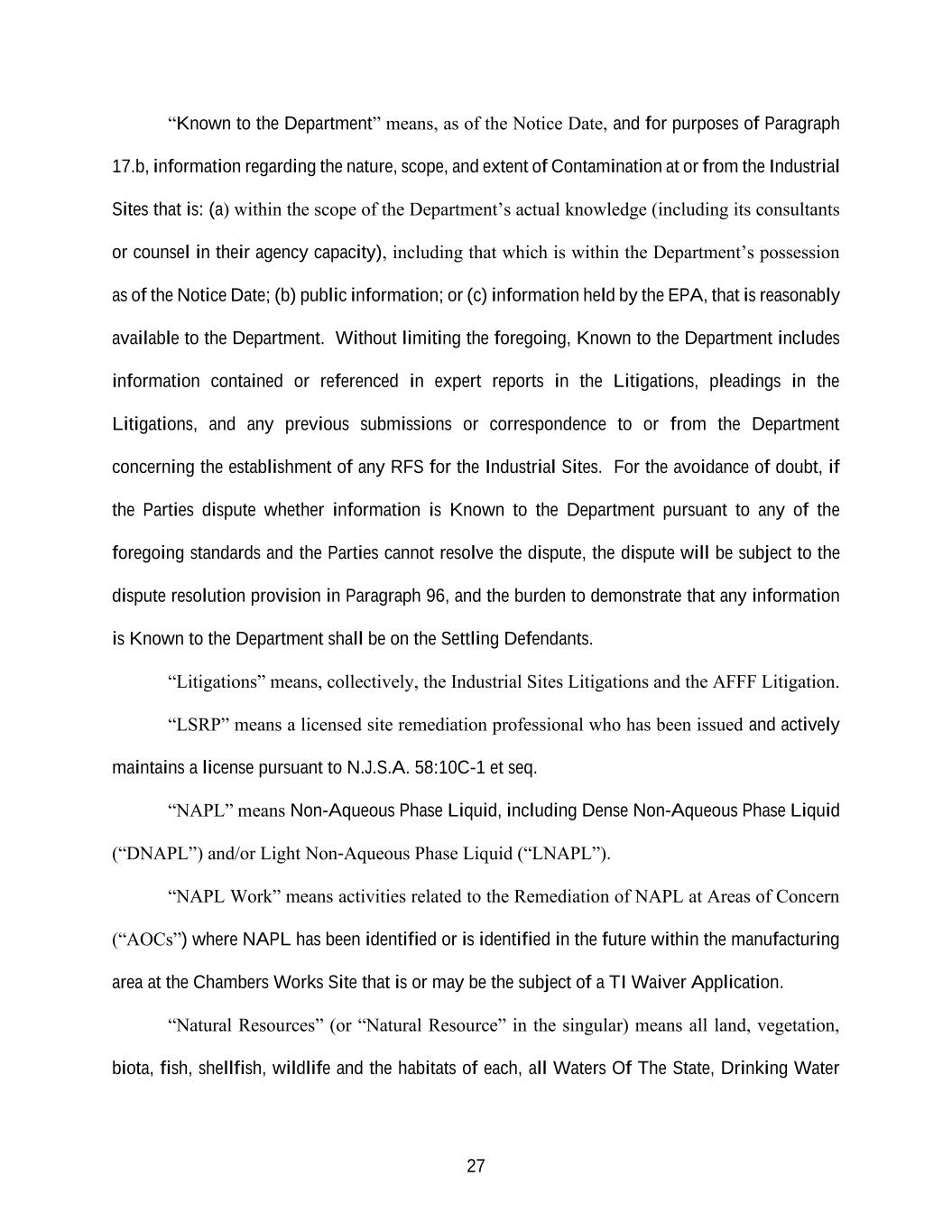 27 “Known to the Department” means, as of the Notice Date, and for purposes of Paragraph 17.b, information regarding the nature, scope, and extent of Contamination at or from the Industrial Sites that is: (a) within the scope of the Department’s actual knowledge (including its consultants or counsel in their agency capacity), including that which is within the Department’s possession as of the Notice Date; (b) public information; or (c) information held by the EPA, that is reasonably available to the Department. Without limiting the foregoing, Known to the Department includes information contained or referenced in expert reports in the Litigations, pleadings in the Litigations, and any previous submissions or correspondence to or from the Department concerning the establishment of any RFS for the Industrial Sites. For the avoidance of doubt, if the Parties dispute whether information is Known to the Department pursuant to any of the foregoing standards and the Parties cannot resolve the dispute, the dispute will be subject to the dispute resolution provision in Paragraph 96, and the burden to demonstrate that any information is Known to the Department shall be on the Settling Defendants. “Litigations” means, collectively, the Industrial Sites Litigations and the AFFF Litigation. “LSRP” means a licensed site remediation professional who has been issued and actively maintains a license pursuant to N.J.S.A. 58:10C-1 et seq. “NAPL” means Non-Aqueous Phase Liquid, including Dense Non-Aqueous Phase Liquid (“DNAPL”) and/or Light Non-Aqueous Phase Liquid (“LNAPL”). “NAPL Work” means activities related to the Remediation of NAPL at Areas of Concern (“AOCs”) where NAPL has been identified or is identified in the future within the manufacturing area at the Chambers Works Site that is or may be the subject of a TI Waiver Application. “Natural Resources” (or “Natural Resource” in the singular) means all land, vegetation, biota, fish, shellfish, wildlife and the habitats of each, all Waters Of The State, Drinking Water