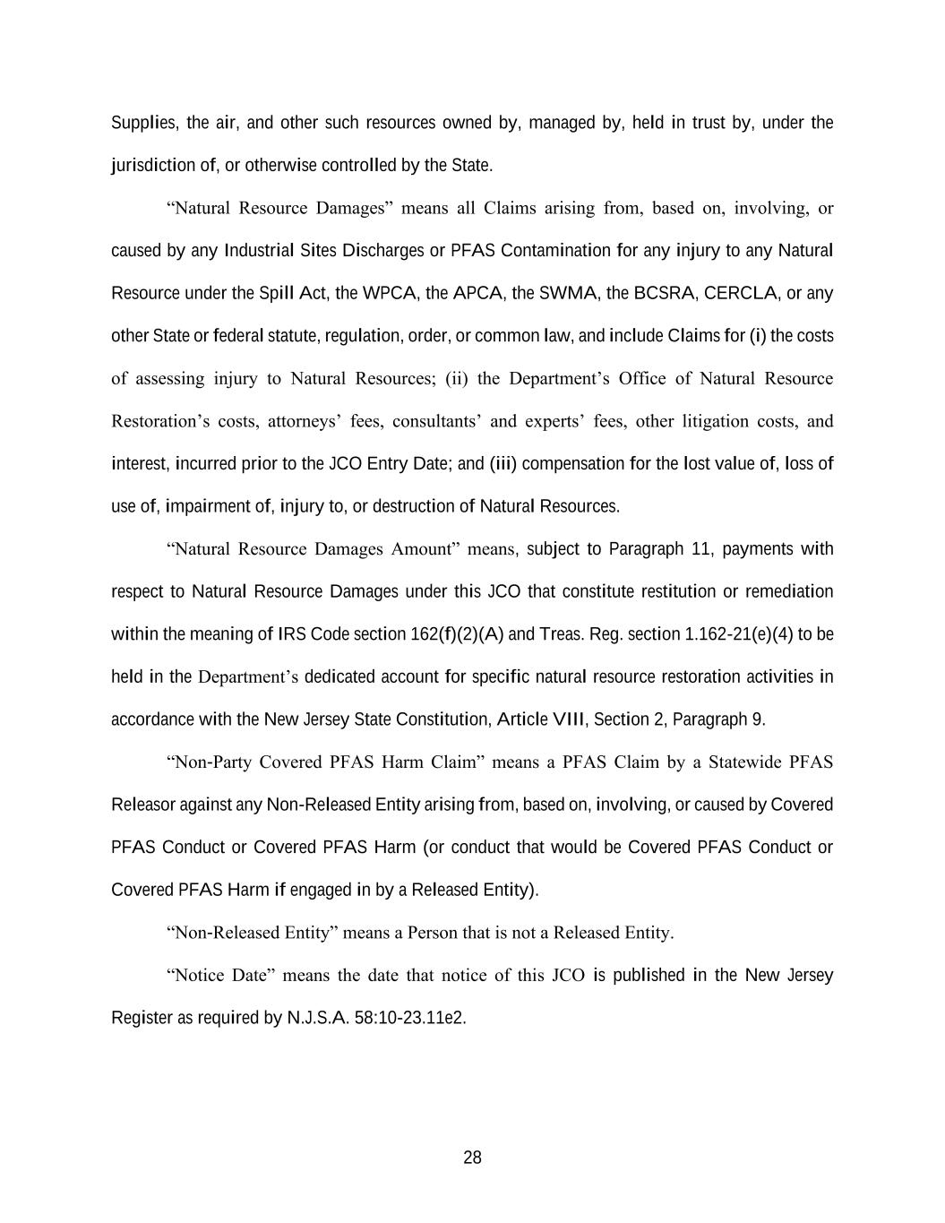 28 Supplies, the air, and other such resources owned by, managed by, held in trust by, under the jurisdiction of, or otherwise controlled by the State. “Natural Resource Damages” means all Claims arising from, based on, involving, or caused by any Industrial Sites Discharges or PFAS Contamination for any injury to any Natural Resource under the Spill Act, the WPCA, the APCA, the SWMA, the BCSRA, CERCLA, or any other State or federal statute, regulation, order, or common law, and include Claims for (i) the costs of assessing injury to Natural Resources; (ii) the Department’s Office of Natural Resource Restoration’s costs, attorneys’ fees, consultants’ and experts’ fees, other litigation costs, and interest, incurred prior to the JCO Entry Date; and (iii) compensation for the lost value of, loss of use of, impairment of, injury to, or destruction of Natural Resources. “Natural Resource Damages Amount” means, subject to Paragraph 11, payments with respect to Natural Resource Damages under this JCO that constitute restitution or remediation within the meaning of IRS Code section 162(f)(2)(A) and Treas. Reg. section 1.162-21(e)(4) to be held in the Department’s dedicated account for specific natural resource restoration activities in accordance with the New Jersey State Constitution, Article VIII, Section 2, Paragraph 9. “Non-Party Covered PFAS Harm Claim” means a PFAS Claim by a Statewide PFAS Releasor against any Non-Released Entity arising from, based on, involving, or caused by Covered PFAS Conduct or Covered PFAS Harm (or conduct that would be Covered PFAS Conduct or Covered PFAS Harm if engaged in by a Released Entity). “Non-Released Entity” means a Person that is not a Released Entity. “Notice Date” means the date that notice of this JCO is published in the New Jersey Register as required by N.J.S.A. 58:10-23.11e2.
