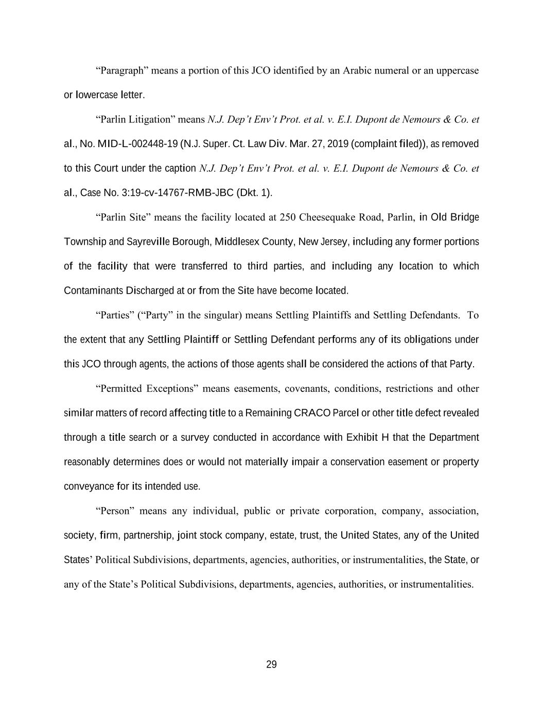 29 “Paragraph” means a portion of this JCO identified by an Arabic numeral or an uppercase or lowercase letter. “Parlin Litigation” means N.J. Dep’t Env’t Prot. et al. v. E.I. Dupont de Nemours & Co. et al., No. MID-L-002448-19 (N.J. Super. Ct. Law Div. Mar. 27, 2019 (complaint filed)), as removed to this Court under the caption N.J. Dep’t Env’t Prot. et al. v. E.I. Dupont de Nemours & Co. et al., Case No. 3:19-cv-14767-RMB-JBC (Dkt. 1). “Parlin Site” means the facility located at 250 Cheesequake Road, Parlin, in Old Bridge Township and Sayreville Borough, Middlesex County, New Jersey, including any former portions of the facility that were transferred to third parties, and including any location to which Contaminants Discharged at or from the Site have become located. “Parties” (“Party” in the singular) means Settling Plaintiffs and Settling Defendants. To the extent that any Settling Plaintiff or Settling Defendant performs any of its obligations under this JCO through agents, the actions of those agents shall be considered the actions of that Party. “Permitted Exceptions” means easements, covenants, conditions, restrictions and other similar matters of record affecting title to a Remaining CRACO Parcel or other title defect revealed through a title search or a survey conducted in accordance with Exhibit H that the Department reasonably determines does or would not materially impair a conservation easement or property conveyance for its intended use. “Person” means any individual, public or private corporation, company, association, society, firm, partnership, joint stock company, estate, trust, the United States, any of the United States’ Political Subdivisions, departments, agencies, authorities, or instrumentalities, the State, or any of the State’s Political Subdivisions, departments, agencies, authorities, or instrumentalities.