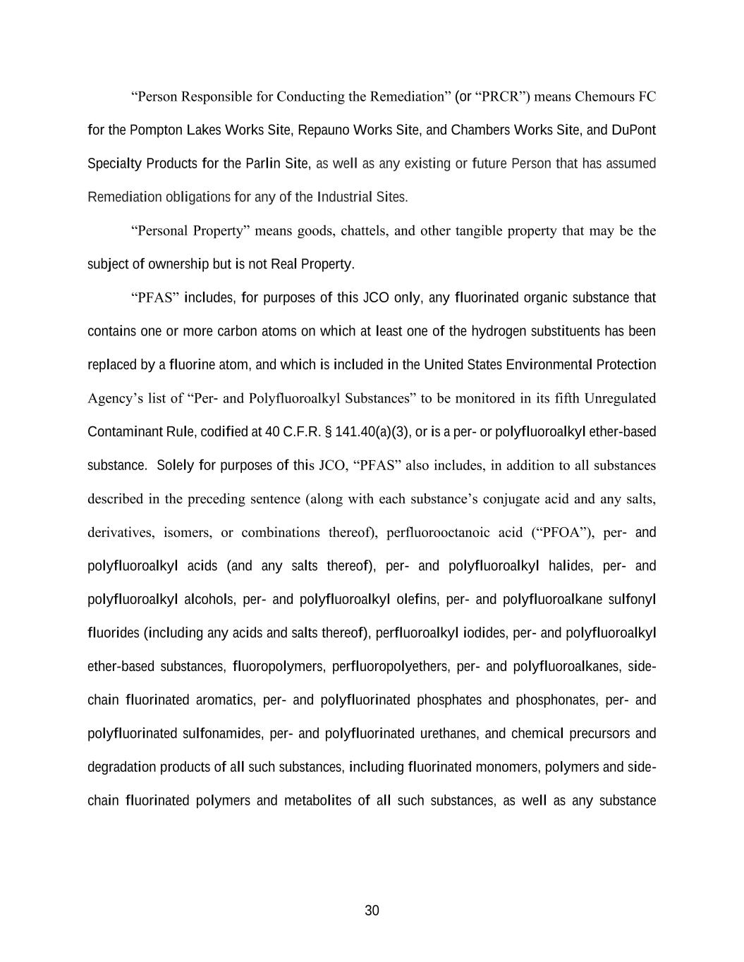 30 “Person Responsible for Conducting the Remediation” (or “PRCR”) means Chemours FC for the Pompton Lakes Works Site, Repauno Works Site, and Chambers Works Site, and DuPont Specialty Products for the Parlin Site, as well as any existing or future Person that has assumed Remediation obligations for any of the Industrial Sites. “Personal Property” means goods, chattels, and other tangible property that may be the subject of ownership but is not Real Property. “PFAS” includes, for purposes of this JCO only, any fluorinated organic substance that contains one or more carbon atoms on which at least one of the hydrogen substituents has been replaced by a fluorine atom, and which is included in the United States Environmental Protection Agency’s list of “Per- and Polyfluoroalkyl Substances” to be monitored in its fifth Unregulated Contaminant Rule, codified at 40 C.F.R. § 141.40(a)(3), or is a per- or polyfluoroalkyl ether-based substance. Solely for purposes of this JCO, “PFAS” also includes, in addition to all substances described in the preceding sentence (along with each substance’s conjugate acid and any salts, derivatives, isomers, or combinations thereof), perfluorooctanoic acid (“PFOA”), per- and polyfluoroalkyl acids (and any salts thereof), per- and polyfluoroalkyl halides, per- and polyfluoroalkyl alcohols, per- and polyfluoroalkyl olefins, per- and polyfluoroalkane sulfonyl fluorides (including any acids and salts thereof), perfluoroalkyl iodides, per- and polyfluoroalkyl ether-based substances, fluoropolymers, perfluoropolyethers, per- and polyfluoroalkanes, side- chain fluorinated aromatics, per- and polyfluorinated phosphates and phosphonates, per- and polyfluorinated sulfonamides, per- and polyfluorinated urethanes, and chemical precursors and degradation products of all such substances, including fluorinated monomers, polymers and side- chain fluorinated polymers and metabolites of all such substances, as well as any substance