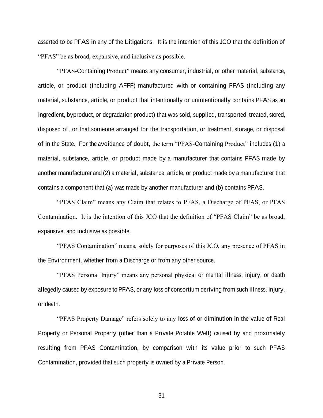 31 asserted to be PFAS in any of the Litigations. It is the intention of this JCO that the definition of “PFAS” be as broad, expansive, and inclusive as possible. “PFAS-Containing Product” means any consumer, industrial, or other material, substance, article, or product (including AFFF) manufactured with or containing PFAS (including any material, substance, article, or product that intentionally or unintentionally contains PFAS as an ingredient, byproduct, or degradation product) that was sold, supplied, transported, treated, stored, disposed of, or that someone arranged for the transportation, or treatment, storage, or disposal of in the State. For the avoidance of doubt, the term “PFAS-Containing Product” includes (1) a material, substance, article, or product made by a manufacturer that contains PFAS made by another manufacturer and (2) a material, substance, article, or product made by a manufacturer that contains a component that (a) was made by another manufacturer and (b) contains PFAS. “PFAS Claim” means any Claim that relates to PFAS, a Discharge of PFAS, or PFAS Contamination. It is the intention of this JCO that the definition of “PFAS Claim” be as broad, expansive, and inclusive as possible. “PFAS Contamination” means, solely for purposes of this JCO, any presence of PFAS in the Environment, whether from a Discharge or from any other source. “PFAS Personal Injury” means any personal physical or mental illness, injury, or death allegedly caused by exposure to PFAS, or any loss of consortium deriving from such illness, injury, or death. “PFAS Property Damage” refers solely to any loss of or diminution in the value of Real Property or Personal Property (other than a Private Potable Well) caused by and proximately resulting from PFAS Contamination, by comparison with its value prior to such PFAS Contamination, provided that such property is owned by a Private Person.