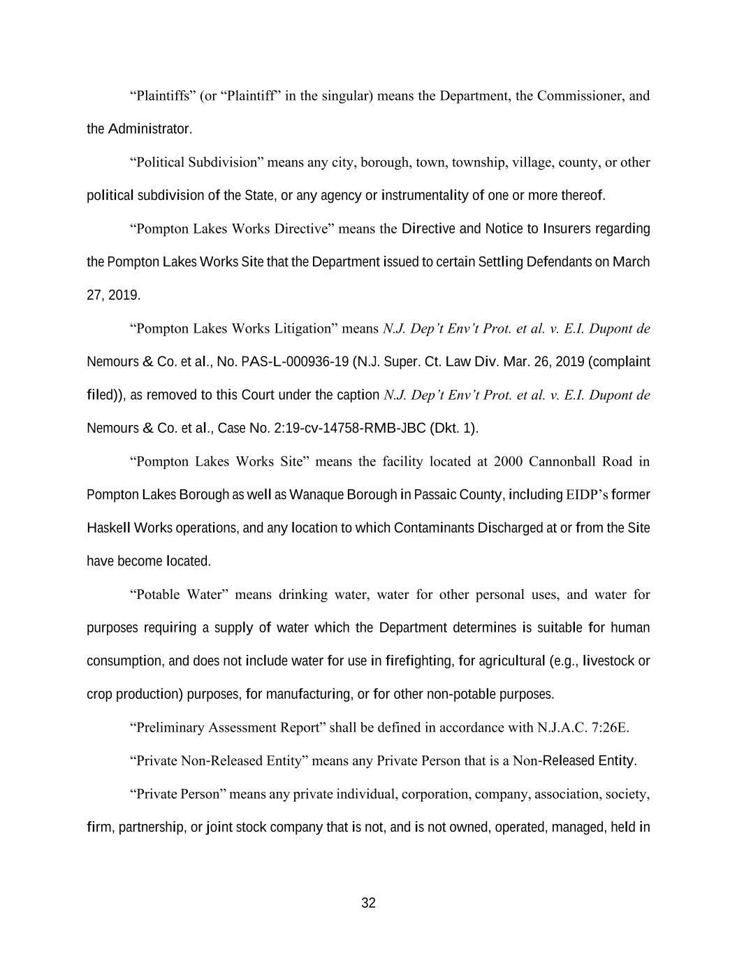 32 “Plaintiffs” (or “Plaintiff” in the singular) means the Department, the Commissioner, and the Administrator. “Political Subdivision” means any city, borough, town, township, village, county, or other political subdivision of the State, or any agency or instrumentality of one or more thereof. “Pompton Lakes Works Directive” means the Directive and Notice to Insurers regarding the Pompton Lakes Works Site that the Department issued to certain Settling Defendants on March 27, 2019. “Pompton Lakes Works Litigation” means N.J. Dep’t Env’t Prot. et al. v. E.I. Dupont de Nemours & Co. et al., No. PAS-L-000936-19 (N.J. Super. Ct. Law Div. Mar. 26, 2019 (complaint filed)), as removed to this Court under the caption N.J. Dep’t Env’t Prot. et al. v. E.I. Dupont de Nemours & Co. et al., Case No. 2:19-cv-14758-RMB-JBC (Dkt. 1). “Pompton Lakes Works Site” means the facility located at 2000 Cannonball Road in Pompton Lakes Borough as well as Wanaque Borough in Passaic County, including EIDP’s former Haskell Works operations, and any location to which Contaminants Discharged at or from the Site have become located. “Potable Water” means drinking water, water for other personal uses, and water for purposes requiring a supply of water which the Department determines is suitable for human consumption, and does not include water for use in firefighting, for agricultural (e.g., livestock or crop production) purposes, for manufacturing, or for other non-potable purposes. “Preliminary Assessment Report” shall be defined in accordance with N.J.A.C. 7:26E. “Private Non-Released Entity” means any Private Person that is a Non-Released Entity. “Private Person” means any private individual, corporation, company, association, society, firm, partnership, or joint stock company that is not, and is not owned, operated, managed, held in