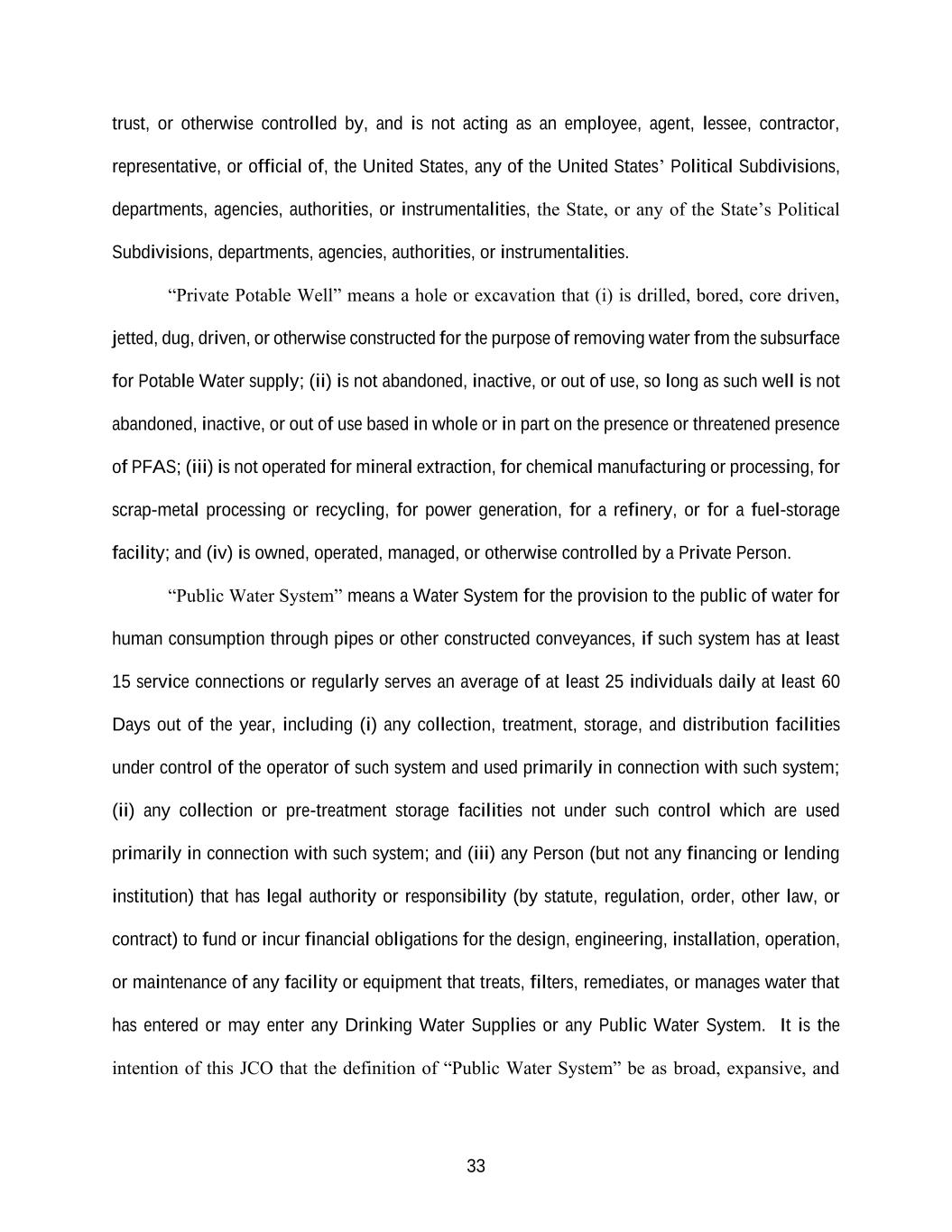 33 trust, or otherwise controlled by, and is not acting as an employee, agent, lessee, contractor, representative, or official of, the United States, any of the United States’ Political Subdivisions, departments, agencies, authorities, or instrumentalities, the State, or any of the State’s Political Subdivisions, departments, agencies, authorities, or instrumentalities. “Private Potable Well” means a hole or excavation that (i) is drilled, bored, core driven, jetted, dug, driven, or otherwise constructed for the purpose of removing water from the subsurface for Potable Water supply; (ii) is not abandoned, inactive, or out of use, so long as such well is not abandoned, inactive, or out of use based in whole or in part on the presence or threatened presence of PFAS; (iii) is not operated for mineral extraction, for chemical manufacturing or processing, for scrap-metal processing or recycling, for power generation, for a refinery, or for a fuel-storage facility; and (iv) is owned, operated, managed, or otherwise controlled by a Private Person. “Public Water System” means a Water System for the provision to the public of water for human consumption through pipes or other constructed conveyances, if such system has at least 15 service connections or regularly serves an average of at least 25 individuals daily at least 60 Days out of the year, including (i) any collection, treatment, storage, and distribution facilities under control of the operator of such system and used primarily in connection with such system; (ii) any collection or pre-treatment storage facilities not under such control which are used primarily in connection with such system; and (iii) any Person (but not any financing or lending institution) that has legal authority or responsibility (by statute, regulation, order, other law, or contract) to fund or incur financial obligations for the design, engineering, installation, operation, or maintenance of any facility or equipment that treats, filters, remediates, or manages water that has entered or may enter any Drinking Water Supplies or any Public Water System. It is the intention of this JCO that the definition of “Public Water System” be as broad, expansive, and