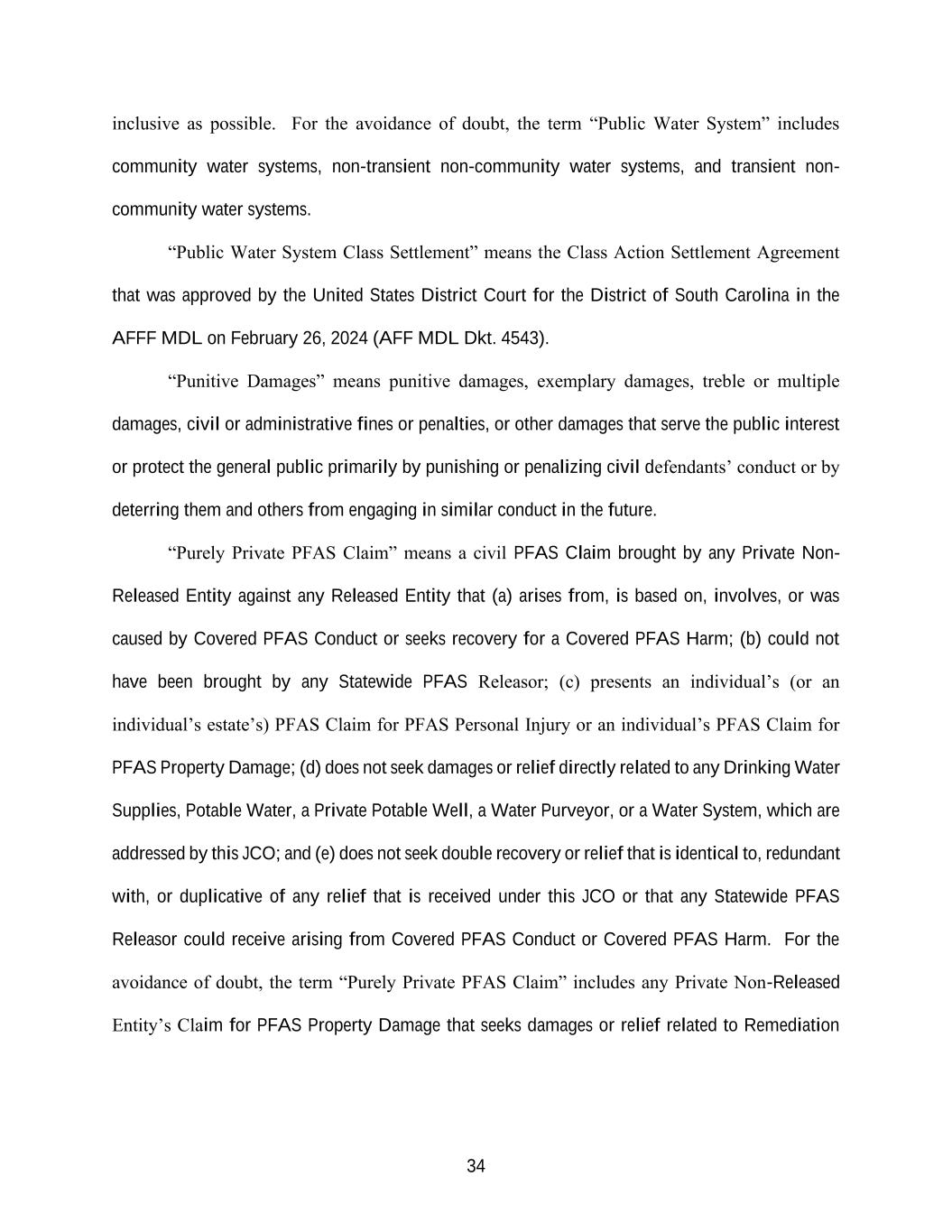 34 inclusive as possible. For the avoidance of doubt, the term “Public Water System” includes community water systems, non-transient non-community water systems, and transient non- community water systems. “Public Water System Class Settlement” means the Class Action Settlement Agreement that was approved by the United States District Court for the District of South Carolina in the AFFF MDL on February 26, 2024 (AFF MDL Dkt. 4543). “Punitive Damages” means punitive damages, exemplary damages, treble or multiple damages, civil or administrative fines or penalties, or other damages that serve the public interest or protect the general public primarily by punishing or penalizing civil defendants’ conduct or by deterring them and others from engaging in similar conduct in the future. “Purely Private PFAS Claim” means a civil PFAS Claim brought by any Private Non- Released Entity against any Released Entity that (a) arises from, is based on, involves, or was caused by Covered PFAS Conduct or seeks recovery for a Covered PFAS Harm; (b) could not have been brought by any Statewide PFAS Releasor; (c) presents an individual’s (or an individual’s estate’s) PFAS Claim for PFAS Personal Injury or an individual’s PFAS Claim for PFAS Property Damage; (d) does not seek damages or relief directly related to any Drinking Water Supplies, Potable Water, a Private Potable Well, a Water Purveyor, or a Water System, which are addressed by this JCO; and (e) does not seek double recovery or relief that is identical to, redundant with, or duplicative of any relief that is received under this JCO or that any Statewide PFAS Releasor could receive arising from Covered PFAS Conduct or Covered PFAS Harm. For the avoidance of doubt, the term “Purely Private PFAS Claim” includes any Private Non-Released Entity’s Claim for PFAS Property Damage that seeks damages or relief related to Remediation