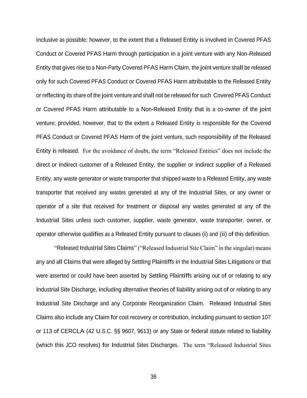 36 inclusive as possible; however, to the extent that a Released Entity is involved in Covered PFAS Conduct or Covered PFAS Harm through participation in a joint venture with any Non-Released Entity that gives rise to a Non-Party Covered PFAS Harm Claim, the joint venture shall be released only for such Covered PFAS Conduct or Covered PFAS Harm attributable to the Released Entity or reflecting its share of the joint venture and shall not be released for such Covered PFAS Conduct or Covered PFAS Harm attributable to a Non-Released Entity that is a co-owner of the joint venture; provided, however, that to the extent a Released Entity is responsible for the Covered PFAS Conduct or Covered PFAS Harm of the joint venture, such responsibility of the Released Entity is released. For the avoidance of doubt, the term “Released Entities” does not include the direct or indirect customer of a Released Entity, the supplier or indirect supplier of a Released Entity, any waste generator or waste transporter that shipped waste to a Released Entity, any waste transporter that received any wastes generated at any of the Industrial Sites, or any owner or operator of a site that received for treatment or disposal any wastes generated at any of the Industrial Sites unless such customer, supplier, waste generator, waste transporter, owner, or operator otherwise qualifies as a Released Entity pursuant to clauses (i) and (ii) of this definition. “Released Industrial Sites Claims” (“Released Industrial Site Claim” in the singular) means any and all Claims that were alleged by Settling Plaintiffs in the Industrial Sites Litigations or that were asserted or could have been asserted by Settling Plaintiffs arising out of or relating to any Industrial Site Discharge, including alternative theories of liability arising out of or relating to any Industrial Site Discharge and any Corporate Reorganization Claim. Released Industrial Sites Claims also include any Claim for cost recovery or contribution, including pursuant to section 107 or 113 of CERCLA (42 U.S.C. §§ 9607, 9613) or any State or federal statute related to liability (which this JCO resolves) for Industrial Sites Discharges. The term “Released Industrial Sites