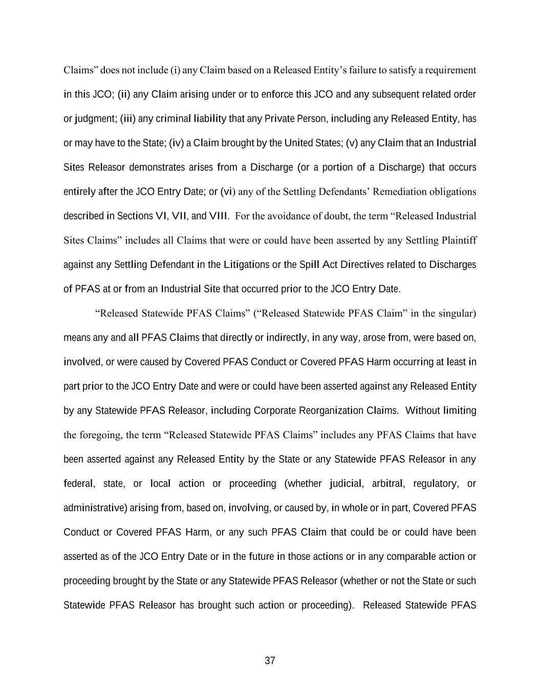 37 Claims” does not include (i) any Claim based on a Released Entity’s failure to satisfy a requirement in this JCO; (ii) any Claim arising under or to enforce this JCO and any subsequent related order or judgment; (iii) any criminal liability that any Private Person, including any Released Entity, has or may have to the State; (iv) a Claim brought by the United States; (v) any Claim that an Industrial Sites Releasor demonstrates arises from a Discharge (or a portion of a Discharge) that occurs entirely after the JCO Entry Date; or (vi) any of the Settling Defendants’ Remediation obligations described in Sections VI, VII, and VIII. For the avoidance of doubt, the term “Released Industrial Sites Claims” includes all Claims that were or could have been asserted by any Settling Plaintiff against any Settling Defendant in the Litigations or the Spill Act Directives related to Discharges of PFAS at or from an Industrial Site that occurred prior to the JCO Entry Date. “Released Statewide PFAS Claims” (“Released Statewide PFAS Claim” in the singular) means any and all PFAS Claims that directly or indirectly, in any way, arose from, were based on, involved, or were caused by Covered PFAS Conduct or Covered PFAS Harm occurring at least in part prior to the JCO Entry Date and were or could have been asserted against any Released Entity by any Statewide PFAS Releasor, including Corporate Reorganization Claims. Without limiting the foregoing, the term “Released Statewide PFAS Claims” includes any PFAS Claims that have been asserted against any Released Entity by the State or any Statewide PFAS Releasor in any federal, state, or local action or proceeding (whether judicial, arbitral, regulatory, or administrative) arising from, based on, involving, or caused by, in whole or in part, Covered PFAS Conduct or Covered PFAS Harm, or any such PFAS Claim that could be or could have been asserted as of the JCO Entry Date or in the future in those actions or in any comparable action or proceeding brought by the State or any Statewide PFAS Releasor (whether or not the State or such Statewide PFAS Releasor has brought such action or proceeding). Released Statewide PFAS