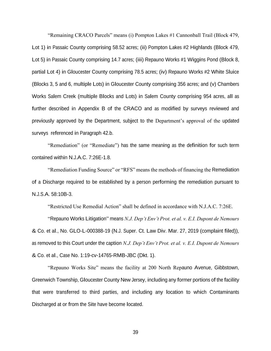 39 “Remaining CRACO Parcels” means (i) Pompton Lakes #1 Cannonball Trail (Block 479, Lot 1) in Passaic County comprising 58.52 acres; (ii) Pompton Lakes #2 Highlands (Block 479, Lot 5) in Passaic County comprising 14.7 acres; (iii) Repauno Works #1 Wiggins Pond (Block 8, partial Lot 4) in Gloucester County comprising 78.5 acres; (iv) Repauno Works #2 White Sluice (Blocks 3, 5 and 6, multiple Lots) in Gloucester County comprising 356 acres; and (v) Chambers Works Salem Creek (multiple Blocks and Lots) in Salem County comprising 954 acres, all as further described in Appendix B of the CRACO and as modified by surveys reviewed and previously approved by the Department, subject to the Department’s approval of the updated surveys referenced in Paragraph 42.b. “Remediation” (or “Remediate”) has the same meaning as the definition for such term contained within N.J.A.C. 7:26E-1.8. “Remediation Funding Source” or “RFS” means the methods of financing the Remediation of a Discharge required to be established by a person performing the remediation pursuant to N.J.S.A. 58:10B-3. “Restricted Use Remedial Action” shall be defined in accordance with N.J.A.C. 7:26E. “Repauno Works Litigation” means N.J. Dep’t Env’t Prot. et al. v. E.I. Dupont de Nemours & Co. et al., No. GLO-L-000388-19 (N.J. Super. Ct. Law Div. Mar. 27, 2019 (complaint filed)), as removed to this Court under the caption N.J. Dep’t Env’t Prot. et al. v. E.I. Dupont de Nemours & Co. et al., Case No. 1:19-cv-14765-RMB-JBC (Dkt. 1). “Repauno Works Site” means the facility at 200 North Repauno Avenue, Gibbstown, Greenwich Township, Gloucester County New Jersey, including any former portions of the facility that were transferred to third parties, and including any location to which Contaminants Discharged at or from the Site have become located.