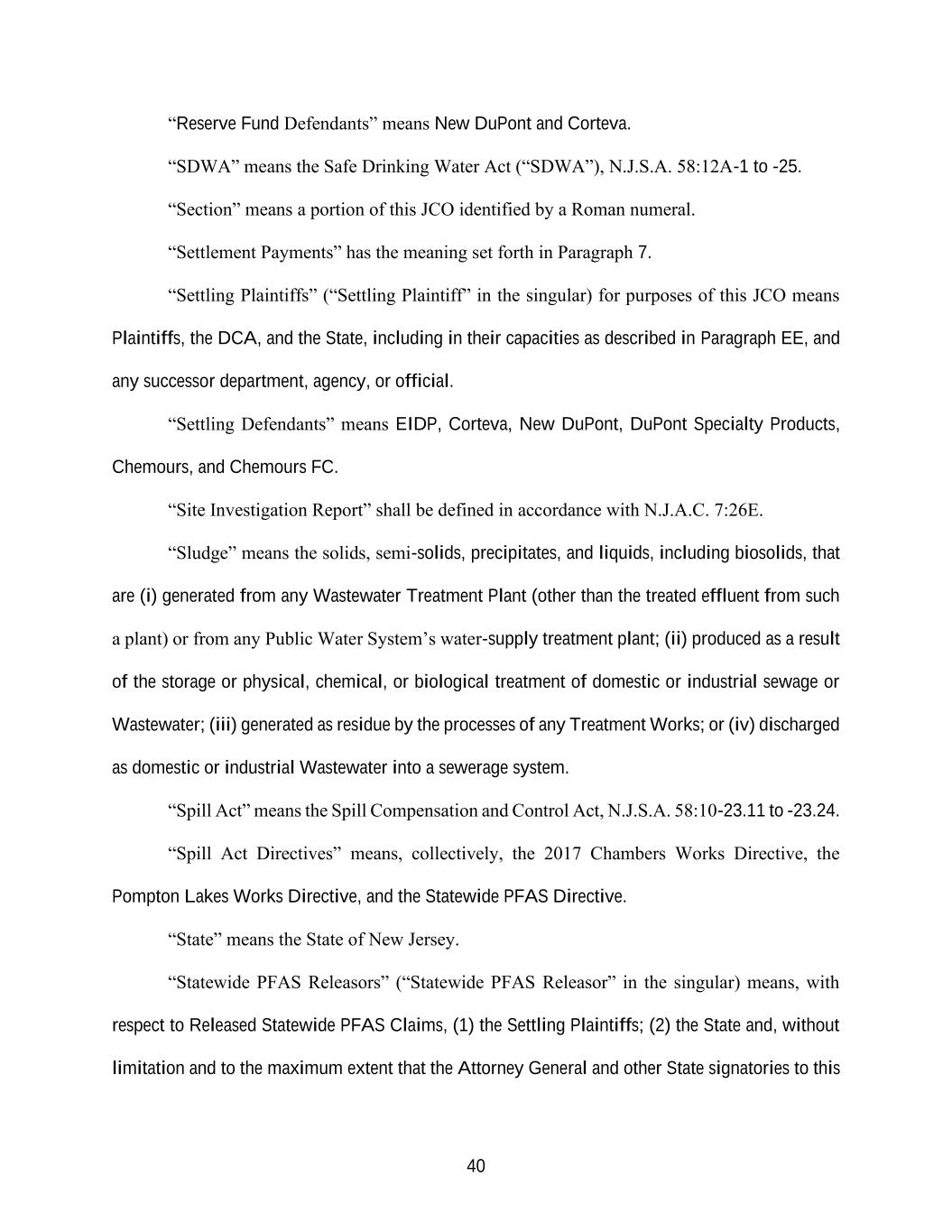 40 “Reserve Fund Defendants” means New DuPont and Corteva. “SDWA” means the Safe Drinking Water Act (“SDWA”), N.J.S.A. 58:12A-1 to -25. “Section” means a portion of this JCO identified by a Roman numeral. “Settlement Payments” has the meaning set forth in Paragraph 7. “Settling Plaintiffs” (“Settling Plaintiff” in the singular) for purposes of this JCO means Plaintiffs, the DCA, and the State, including in their capacities as described in Paragraph EE, and any successor department, agency, or official. “Settling Defendants” means EIDP, Corteva, New DuPont, DuPont Specialty Products, Chemours, and Chemours FC. “Site Investigation Report” shall be defined in accordance with N.J.A.C. 7:26E. “Sludge” means the solids, semi-solids, precipitates, and liquids, including biosolids, that are (i) generated from any Wastewater Treatment Plant (other than the treated effluent from such a plant) or from any Public Water System’s water-supply treatment plant; (ii) produced as a result of the storage or physical, chemical, or biological treatment of domestic or industrial sewage or Wastewater; (iii) generated as residue by the processes of any Treatment Works; or (iv) discharged as domestic or industrial Wastewater into a sewerage system. “Spill Act” means the Spill Compensation and Control Act, N.J.S.A. 58:10-23.11 to -23.24. “Spill Act Directives” means, collectively, the 2017 Chambers Works Directive, the Pompton Lakes Works Directive, and the Statewide PFAS Directive. “State” means the State of New Jersey. “Statewide PFAS Releasors” (“Statewide PFAS Releasor” in the singular) means, with respect to Released Statewide PFAS Claims, (1) the Settling Plaintiffs; (2) the State and, without limitation and to the maximum extent that the Attorney General and other State signatories to this