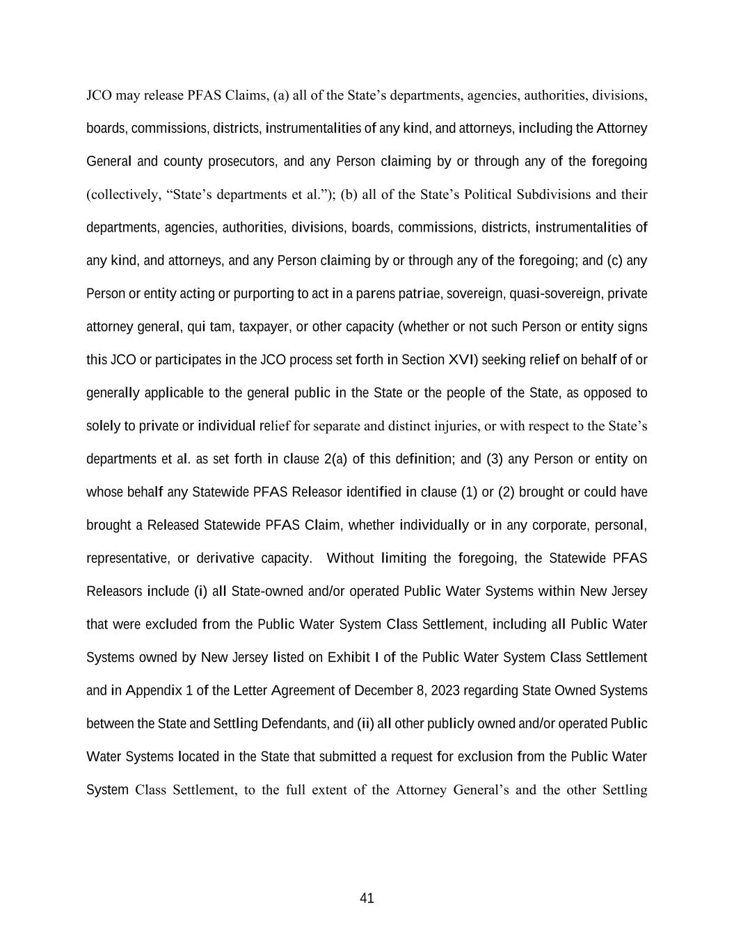 41 JCO may release PFAS Claims, (a) all of the State’s departments, agencies, authorities, divisions, boards, commissions, districts, instrumentalities of any kind, and attorneys, including the Attorney General and county prosecutors, and any Person claiming by or through any of the foregoing (collectively, “State’s departments et al.”); (b) all of the State’s Political Subdivisions and their departments, agencies, authorities, divisions, boards, commissions, districts, instrumentalities of any kind, and attorneys, and any Person claiming by or through any of the foregoing; and (c) any Person or entity acting or purporting to act in a parens patriae, sovereign, quasi-sovereign, private attorney general, qui tam, taxpayer, or other capacity (whether or not such Person or entity signs this JCO or participates in the JCO process set forth in Section XVI) seeking relief on behalf of or generally applicable to the general public in the State or the people of the State, as opposed to solely to private or individual relief for separate and distinct injuries, or with respect to the State’s departments et al. as set forth in clause 2(a) of this definition; and (3) any Person or entity on whose behalf any Statewide PFAS Releasor identified in clause (1) or (2) brought or could have brought a Released Statewide PFAS Claim, whether individually or in any corporate, personal, representative, or derivative capacity. Without limiting the foregoing, the Statewide PFAS Releasors include (i) all State-owned and/or operated Public Water Systems within New Jersey that were excluded from the Public Water System Class Settlement, including all Public Water Systems owned by New Jersey listed on Exhibit I of the Public Water System Class Settlement and in Appendix 1 of the Letter Agreement of December 8, 2023 regarding State Owned Systems between the State and Settling Defendants, and (ii) all other publicly owned and/or operated Public Water Systems located in the State that submitted a request for exclusion from the Public Water System Class Settlement, to the full extent of the Attorney General’s and the other Settling