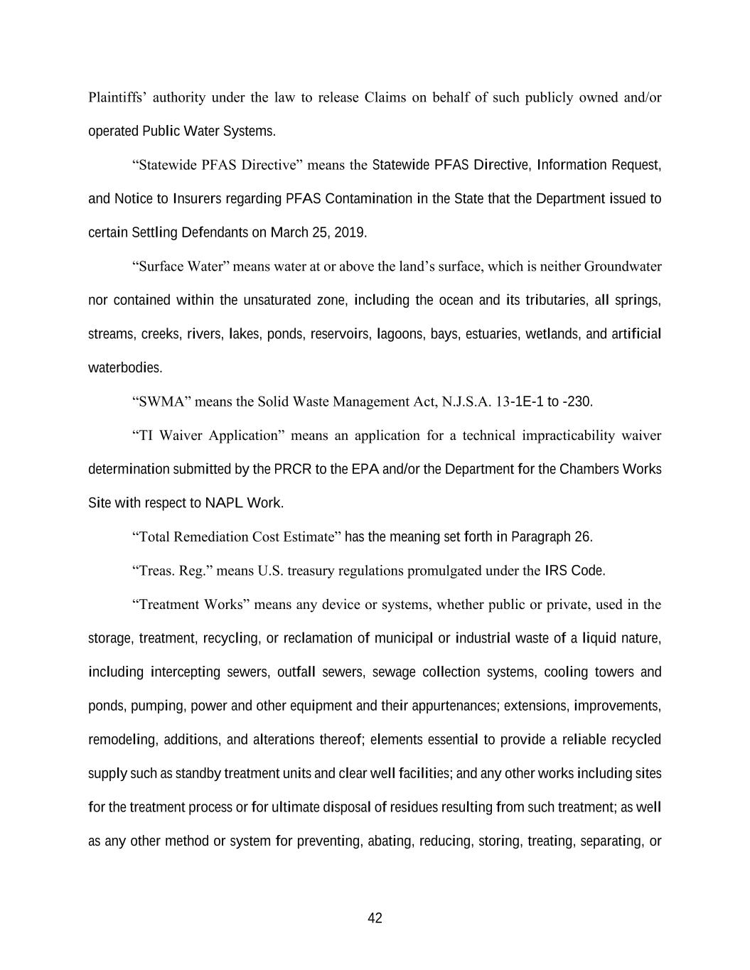42 Plaintiffs’ authority under the law to release Claims on behalf of such publicly owned and/or operated Public Water Systems. “Statewide PFAS Directive” means the Statewide PFAS Directive, Information Request, and Notice to Insurers regarding PFAS Contamination in the State that the Department issued to certain Settling Defendants on March 25, 2019. “Surface Water” means water at or above the land’s surface, which is neither Groundwater nor contained within the unsaturated zone, including the ocean and its tributaries, all springs, streams, creeks, rivers, lakes, ponds, reservoirs, lagoons, bays, estuaries, wetlands, and artificial waterbodies. “SWMA” means the Solid Waste Management Act, N.J.S.A. 13-1E-1 to -230. “TI Waiver Application” means an application for a technical impracticability waiver determination submitted by the PRCR to the EPA and/or the Department for the Chambers Works Site with respect to NAPL Work. “Total Remediation Cost Estimate” has the meaning set forth in Paragraph 26. “Treas. Reg.” means U.S. treasury regulations promulgated under the IRS Code. “Treatment Works” means any device or systems, whether public or private, used in the storage, treatment, recycling, or reclamation of municipal or industrial waste of a liquid nature, including intercepting sewers, outfall sewers, sewage collection systems, cooling towers and ponds, pumping, power and other equipment and their appurtenances; extensions, improvements, remodeling, additions, and alterations thereof; elements essential to provide a reliable recycled supply such as standby treatment units and clear well facilities; and any other works including sites for the treatment process or for ultimate disposal of residues resulting from such treatment; as well as any other method or system for preventing, abating, reducing, storing, treating, separating, or