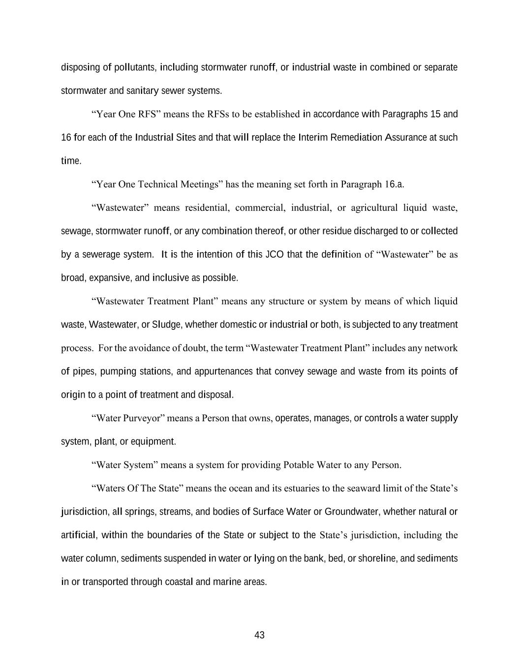 43 disposing of pollutants, including stormwater runoff, or industrial waste in combined or separate stormwater and sanitary sewer systems. “Year One RFS” means the RFSs to be established in accordance with Paragraphs 15 and 16 for each of the Industrial Sites and that will replace the Interim Remediation Assurance at such time. “Year One Technical Meetings” has the meaning set forth in Paragraph 16.a. “Wastewater” means residential, commercial, industrial, or agricultural liquid waste, sewage, stormwater runoff, or any combination thereof, or other residue discharged to or collected by a sewerage system. It is the intention of this JCO that the definition of “Wastewater” be as broad, expansive, and inclusive as possible. “Wastewater Treatment Plant” means any structure or system by means of which liquid waste, Wastewater, or Sludge, whether domestic or industrial or both, is subjected to any treatment process. For the avoidance of doubt, the term “Wastewater Treatment Plant” includes any network of pipes, pumping stations, and appurtenances that convey sewage and waste from its points of origin to a point of treatment and disposal. “Water Purveyor” means a Person that owns, operates, manages, or controls a water supply system, plant, or equipment. “Water System” means a system for providing Potable Water to any Person. “Waters Of The State” means the ocean and its estuaries to the seaward limit of the State’s jurisdiction, all springs, streams, and bodies of Surface Water or Groundwater, whether natural or artificial, within the boundaries of the State or subject to the State’s jurisdiction, including the water column, sediments suspended in water or lying on the bank, bed, or shoreline, and sediments in or transported through coastal and marine areas.