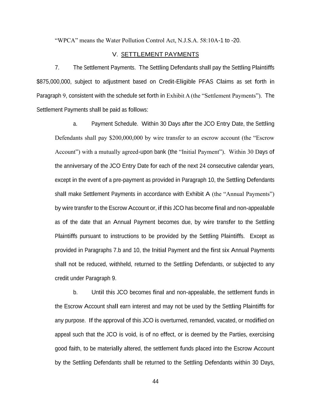 44 “WPCA” means the Water Pollution Control Act, N.J.S.A. 58:10A-1 to -20. V. SETTLEMENT PAYMENTS 7. The Settlement Payments. The Settling Defendants shall pay the Settling Plaintiffs $875,000,000, subject to adjustment based on Credit-Eligible PFAS Claims as set forth in Paragraph 9, consistent with the schedule set forth in Exhibit A (the “Settlement Payments”). The Settlement Payments shall be paid as follows: a. Payment Schedule. Within 30 Days after the JCO Entry Date, the Settling Defendants shall pay $200,000,000 by wire transfer to an escrow account (the “Escrow Account”) with a mutually agreed-upon bank (the “Initial Payment”). Within 30 Days of the anniversary of the JCO Entry Date for each of the next 24 consecutive calendar years, except in the event of a pre-payment as provided in Paragraph 10, the Settling Defendants shall make Settlement Payments in accordance with Exhibit A (the “Annual Payments”) by wire transfer to the Escrow Account or, if this JCO has become final and non-appealable as of the date that an Annual Payment becomes due, by wire transfer to the Settling Plaintiffs pursuant to instructions to be provided by the Settling Plaintiffs. Except as provided in Paragraphs 7.b and 10, the Initial Payment and the first six Annual Payments shall not be reduced, withheld, returned to the Settling Defendants, or subjected to any credit under Paragraph 9. b. Until this JCO becomes final and non-appealable, the settlement funds in the Escrow Account shall earn interest and may not be used by the Settling Plaintiffs for any purpose. If the approval of this JCO is overturned, remanded, vacated, or modified on appeal such that the JCO is void, is of no effect, or is deemed by the Parties, exercising good faith, to be materially altered, the settlement funds placed into the Escrow Account by the Settling Defendants shall be returned to the Settling Defendants within 30 Days,
