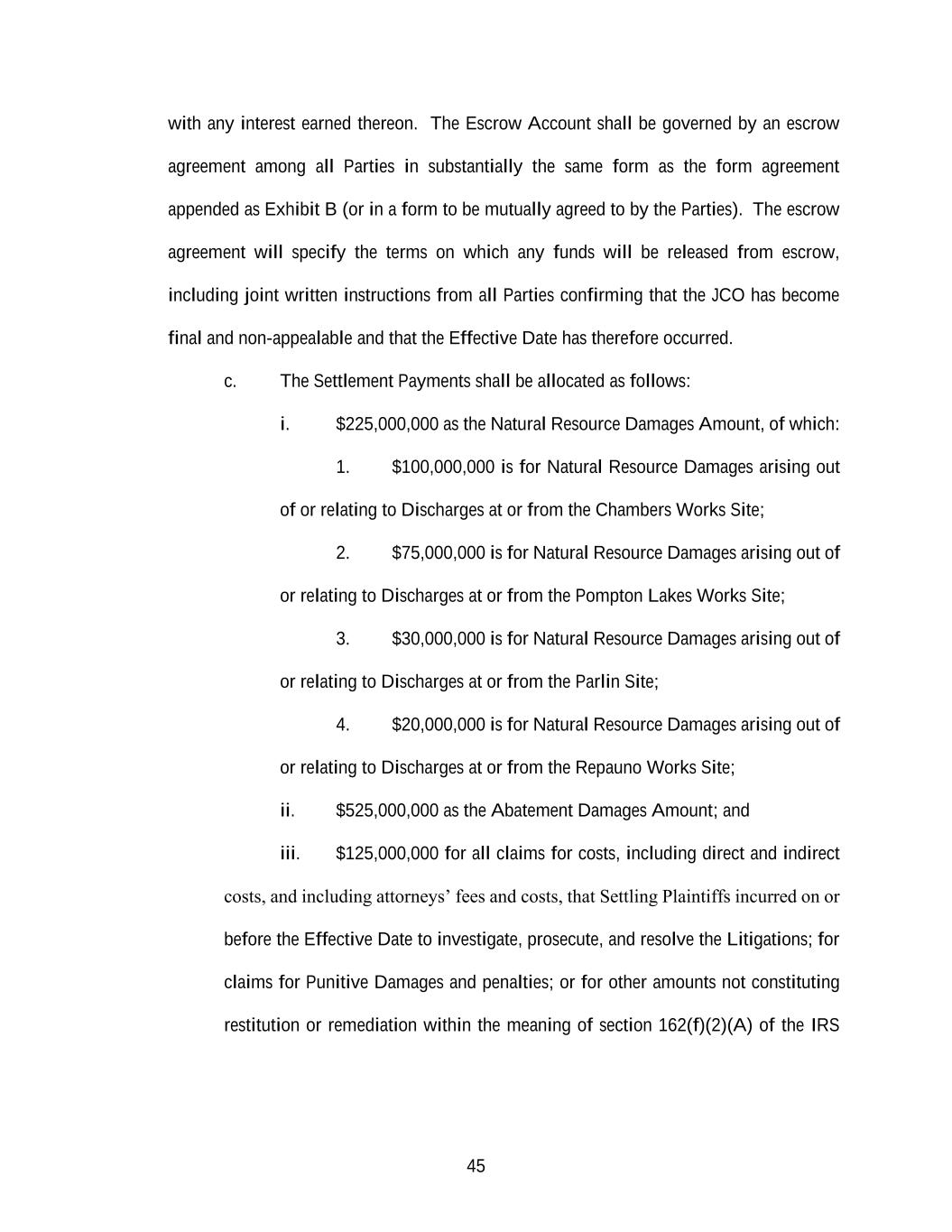 45 with any interest earned thereon. The Escrow Account shall be governed by an escrow agreement among all Parties in substantially the same form as the form agreement appended as Exhibit B (or in a form to be mutually agreed to by the Parties). The escrow agreement will specify the terms on which any funds will be released from escrow, including joint written instructions from all Parties confirming that the JCO has become final and non-appealable and that the Effective Date has therefore occurred. c. The Settlement Payments shall be allocated as follows: i. $225,000,000 as the Natural Resource Damages Amount, of which: 1. $100,000,000 is for Natural Resource Damages arising out of or relating to Discharges at or from the Chambers Works Site; 2. $75,000,000 is for Natural Resource Damages arising out of or relating to Discharges at or from the Pompton Lakes Works Site; 3. $30,000,000 is for Natural Resource Damages arising out of or relating to Discharges at or from the Parlin Site; 4. $20,000,000 is for Natural Resource Damages arising out of or relating to Discharges at or from the Repauno Works Site; ii. $525,000,000 as the Abatement Damages Amount; and iii. $125,000,000 for all claims for costs, including direct and indirect costs, and including attorneys’ fees and costs, that Settling Plaintiffs incurred on or before the Effective Date to investigate, prosecute, and resolve the Litigations; for claims for Punitive Damages and penalties; or for other amounts not constituting restitution or remediation within the meaning of section 162(f)(2)(A) of the IRS