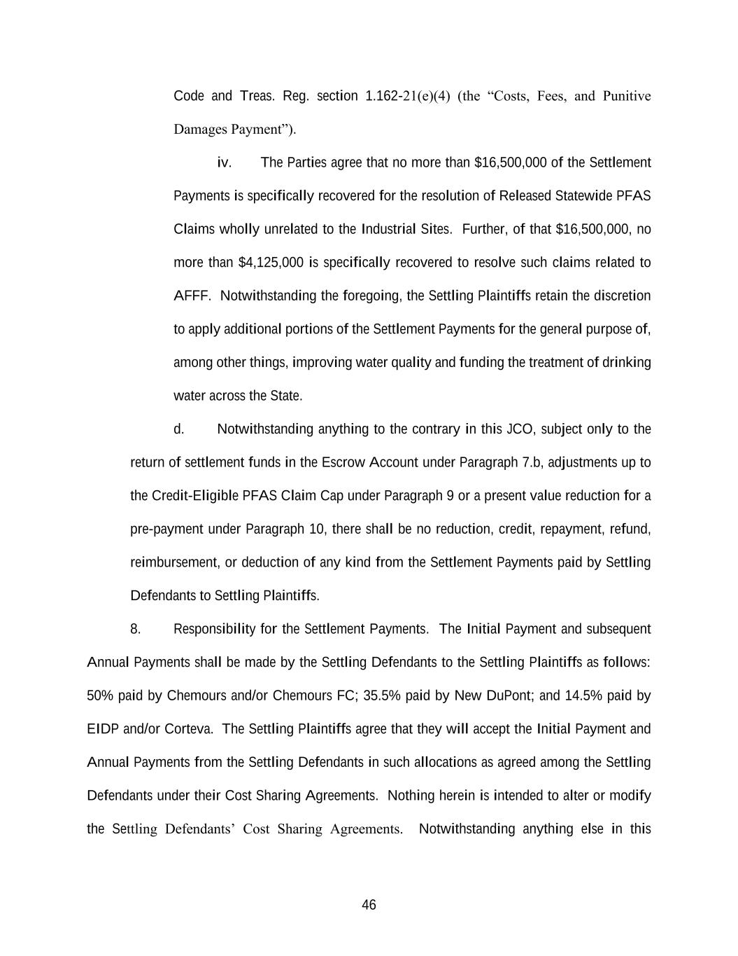 46 Code and Treas. Reg. section 1.162-21(e)(4) (the “Costs, Fees, and Punitive Damages Payment”). iv. The Parties agree that no more than $16,500,000 of the Settlement Payments is specifically recovered for the resolution of Released Statewide PFAS Claims wholly unrelated to the Industrial Sites. Further, of that $16,500,000, no more than $4,125,000 is specifically recovered to resolve such claims related to AFFF. Notwithstanding the foregoing, the Settling Plaintiffs retain the discretion to apply additional portions of the Settlement Payments for the general purpose of, among other things, improving water quality and funding the treatment of drinking water across the State. d. Notwithstanding anything to the contrary in this JCO, subject only to the return of settlement funds in the Escrow Account under Paragraph 7.b, adjustments up to the Credit-Eligible PFAS Claim Cap under Paragraph 9 or a present value reduction for a pre-payment under Paragraph 10, there shall be no reduction, credit, repayment, refund, reimbursement, or deduction of any kind from the Settlement Payments paid by Settling Defendants to Settling Plaintiffs. 8. Responsibility for the Settlement Payments. The Initial Payment and subsequent Annual Payments shall be made by the Settling Defendants to the Settling Plaintiffs as follows: 50% paid by Chemours and/or Chemours FC; 35.5% paid by New DuPont; and 14.5% paid by EIDP and/or Corteva. The Settling Plaintiffs agree that they will accept the Initial Payment and Annual Payments from the Settling Defendants in such allocations as agreed among the Settling Defendants under their Cost Sharing Agreements. Nothing herein is intended to alter or modify the Settling Defendants’ Cost Sharing Agreements. Notwithstanding anything else in this