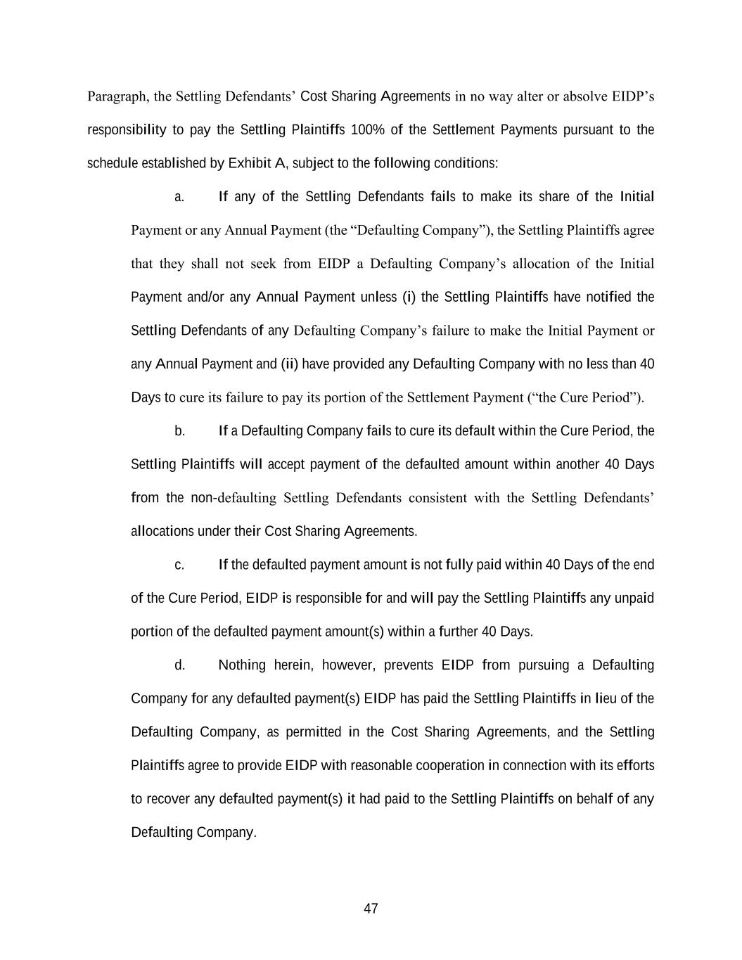 47 Paragraph, the Settling Defendants’ Cost Sharing Agreements in no way alter or absolve EIDP’s responsibility to pay the Settling Plaintiffs 100% of the Settlement Payments pursuant to the schedule established by Exhibit A, subject to the following conditions: a. If any of the Settling Defendants fails to make its share of the Initial Payment or any Annual Payment (the “Defaulting Company”), the Settling Plaintiffs agree that they shall not seek from EIDP a Defaulting Company’s allocation of the Initial Payment and/or any Annual Payment unless (i) the Settling Plaintiffs have notified the Settling Defendants of any Defaulting Company’s failure to make the Initial Payment or any Annual Payment and (ii) have provided any Defaulting Company with no less than 40 Days to cure its failure to pay its portion of the Settlement Payment (“the Cure Period”). b. If a Defaulting Company fails to cure its default within the Cure Period, the Settling Plaintiffs will accept payment of the defaulted amount within another 40 Days from the non-defaulting Settling Defendants consistent with the Settling Defendants’ allocations under their Cost Sharing Agreements. c. If the defaulted payment amount is not fully paid within 40 Days of the end of the Cure Period, EIDP is responsible for and will pay the Settling Plaintiffs any unpaid portion of the defaulted payment amount(s) within a further 40 Days. d. Nothing herein, however, prevents EIDP from pursuing a Defaulting Company for any defaulted payment(s) EIDP has paid the Settling Plaintiffs in lieu of the Defaulting Company, as permitted in the Cost Sharing Agreements, and the Settling Plaintiffs agree to provide EIDP with reasonable cooperation in connection with its efforts to recover any defaulted payment(s) it had paid to the Settling Plaintiffs on behalf of any Defaulting Company.