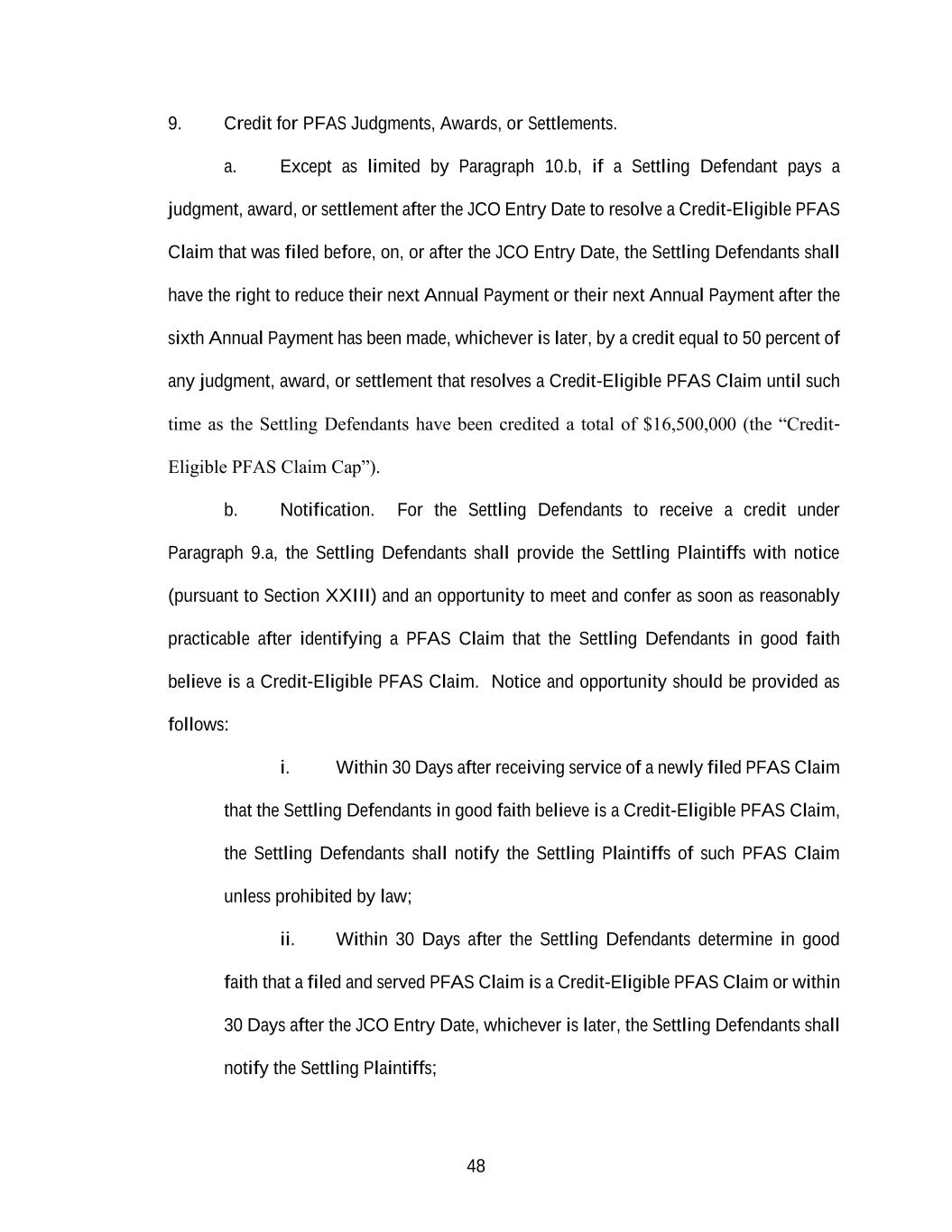 48 9. Credit for PFAS Judgments, Awards, or Settlements. a. Except as limited by Paragraph 10.b, if a Settling Defendant pays a judgment, award, or settlement after the JCO Entry Date to resolve a Credit-Eligible PFAS Claim that was filed before, on, or after the JCO Entry Date, the Settling Defendants shall have the right to reduce their next Annual Payment or their next Annual Payment after the sixth Annual Payment has been made, whichever is later, by a credit equal to 50 percent of any judgment, award, or settlement that resolves a Credit-Eligible PFAS Claim until such time as the Settling Defendants have been credited a total of $16,500,000 (the “Credit- Eligible PFAS Claim Cap”). b. Notification. For the Settling Defendants to receive a credit under Paragraph 9.a, the Settling Defendants shall provide the Settling Plaintiffs with notice (pursuant to Section XXIII) and an opportunity to meet and confer as soon as reasonably practicable after identifying a PFAS Claim that the Settling Defendants in good faith believe is a Credit-Eligible PFAS Claim. Notice and opportunity should be provided as follows: i. Within 30 Days after receiving service of a newly filed PFAS Claim that the Settling Defendants in good faith believe is a Credit-Eligible PFAS Claim, the Settling Defendants shall notify the Settling Plaintiffs of such PFAS Claim unless prohibited by law; ii. Within 30 Days after the Settling Defendants determine in good faith that a filed and served PFAS Claim is a Credit-Eligible PFAS Claim or within 30 Days after the JCO Entry Date, whichever is later, the Settling Defendants shall notify the Settling Plaintiffs;