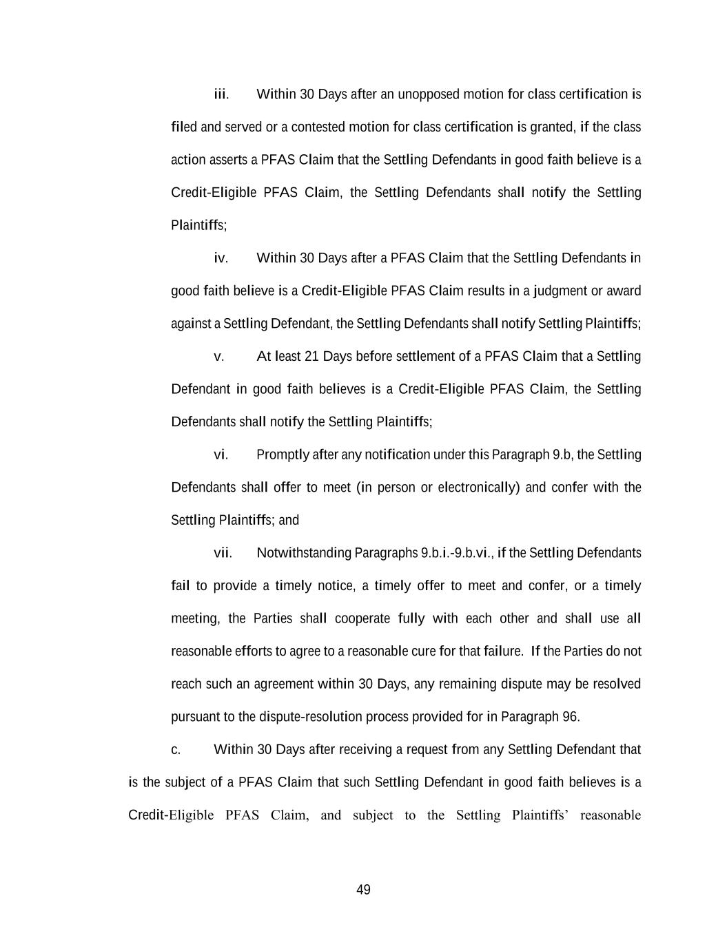 49 iii. Within 30 Days after an unopposed motion for class certification is filed and served or a contested motion for class certification is granted, if the class action asserts a PFAS Claim that the Settling Defendants in good faith believe is a Credit-Eligible PFAS Claim, the Settling Defendants shall notify the Settling Plaintiffs; iv. Within 30 Days after a PFAS Claim that the Settling Defendants in good faith believe is a Credit-Eligible PFAS Claim results in a judgment or award against a Settling Defendant, the Settling Defendants shall notify Settling Plaintiffs; v. At least 21 Days before settlement of a PFAS Claim that a Settling Defendant in good faith believes is a Credit-Eligible PFAS Claim, the Settling Defendants shall notify the Settling Plaintiffs; vi. Promptly after any notification under this Paragraph 9.b, the Settling Defendants shall offer to meet (in person or electronically) and confer with the Settling Plaintiffs; and vii. Notwithstanding Paragraphs 9.b.i.-9.b.vi., if the Settling Defendants fail to provide a timely notice, a timely offer to meet and confer, or a timely meeting, the Parties shall cooperate fully with each other and shall use all reasonable efforts to agree to a reasonable cure for that failure. If the Parties do not reach such an agreement within 30 Days, any remaining dispute may be resolved pursuant to the dispute-resolution process provided for in Paragraph 96. c. Within 30 Days after receiving a request from any Settling Defendant that is the subject of a PFAS Claim that such Settling Defendant in good faith believes is a Credit-Eligible PFAS Claim, and subject to the Settling Plaintiffs’ reasonable