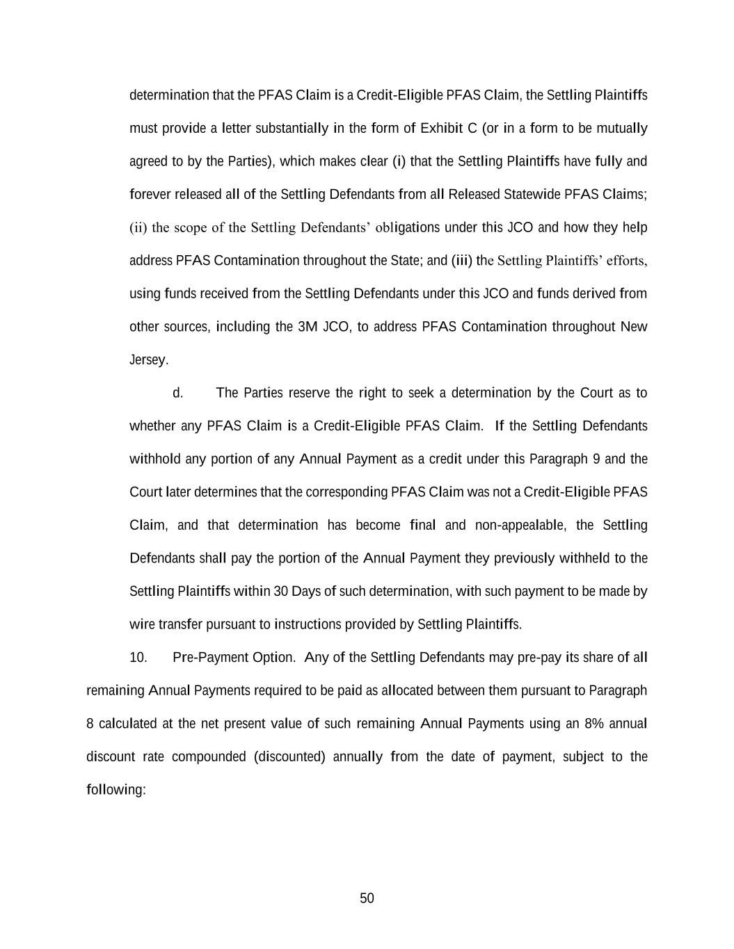 50 determination that the PFAS Claim is a Credit-Eligible PFAS Claim, the Settling Plaintiffs must provide a letter substantially in the form of Exhibit C (or in a form to be mutually agreed to by the Parties), which makes clear (i) that the Settling Plaintiffs have fully and forever released all of the Settling Defendants from all Released Statewide PFAS Claims; (ii) the scope of the Settling Defendants’ obligations under this JCO and how they help address PFAS Contamination throughout the State; and (iii) the Settling Plaintiffs’ efforts, using funds received from the Settling Defendants under this JCO and funds derived from other sources, including the 3M JCO, to address PFAS Contamination throughout New Jersey. d. The Parties reserve the right to seek a determination by the Court as to whether any PFAS Claim is a Credit-Eligible PFAS Claim. If the Settling Defendants withhold any portion of any Annual Payment as a credit under this Paragraph 9 and the Court later determines that the corresponding PFAS Claim was not a Credit-Eligible PFAS Claim, and that determination has become final and non-appealable, the Settling Defendants shall pay the portion of the Annual Payment they previously withheld to the Settling Plaintiffs within 30 Days of such determination, with such payment to be made by wire transfer pursuant to instructions provided by Settling Plaintiffs. 10. Pre-Payment Option. Any of the Settling Defendants may pre-pay its share of all remaining Annual Payments required to be paid as allocated between them pursuant to Paragraph 8 calculated at the net present value of such remaining Annual Payments using an 8% annual discount rate compounded (discounted) annually from the date of payment, subject to the following: