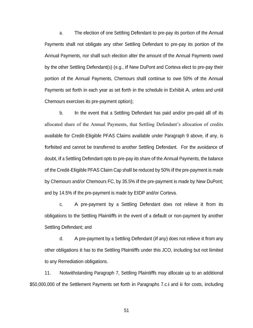 51 a. The election of one Settling Defendant to pre-pay its portion of the Annual Payments shall not obligate any other Settling Defendant to pre-pay its portion of the Annual Payments, nor shall such election alter the amount of the Annual Payments owed by the other Settling Defendant(s) (e.g., if New DuPont and Corteva elect to pre-pay their portion of the Annual Payments, Chemours shall continue to owe 50% of the Annual Payments set forth in each year as set forth in the schedule in Exhibit A, unless and until Chemours exercises its pre-payment option); b. In the event that a Settling Defendant has paid and/or pre-paid all of its allocated share of the Annual Payments, that Settling Defendant’s allocation of credits available for Credit-Eligible PFAS Claims available under Paragraph 9 above, if any, is forfeited and cannot be transferred to another Settling Defendant. For the avoidance of doubt, if a Settling Defendant opts to pre-pay its share of the Annual Payments, the balance of the Credit-Eligible PFAS Claim Cap shall be reduced by 50% if the pre-payment is made by Chemours and/or Chemours FC, by 35.5% if the pre-payment is made by New DuPont; and by 14.5% if the pre-payment is made by EIDP and/or Corteva. c. A pre-payment by a Settling Defendant does not relieve it from its obligations to the Settling Plaintiffs in the event of a default or non-payment by another Settling Defendant; and d. A pre-payment by a Settling Defendant (if any) does not relieve it from any other obligations it has to the Settling Plaintiffs under this JCO, including but not limited to any Remediation obligations. 11. Notwithstanding Paragraph 7, Settling Plaintiffs may allocate up to an additional $50,000,000 of the Settlement Payments set forth in Paragraphs 7.c.i and ii for costs, including